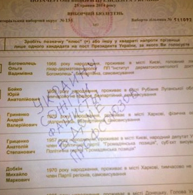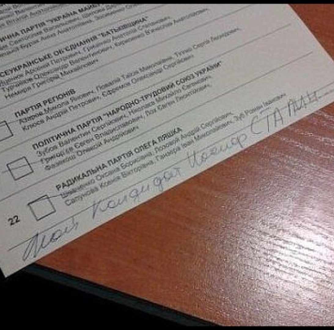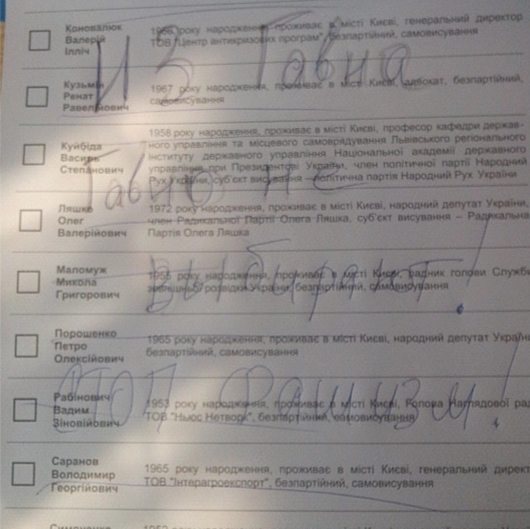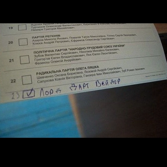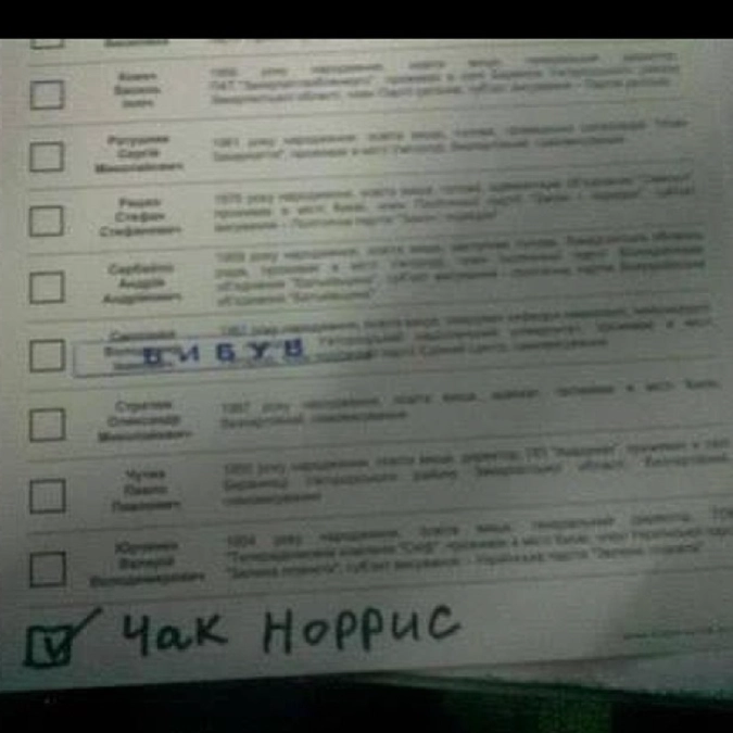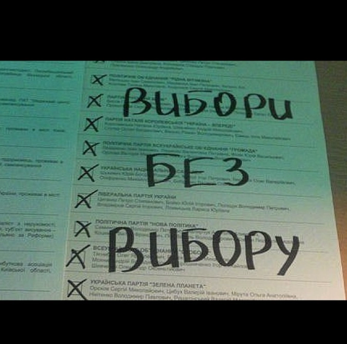 Пока в Киеве делают громкие заявления о высокой явке на избирательные участки для голосования на выборах президента, граждане Украины, возмущенные списком фамилий кандидатов, повсеместно дописывают в бюллетени свои собственные варианты. Среди «предлагаемых» кандидатов: Владимир Путин, Рамзан Кадыров, Иосиф Сталин, Дарт Вейдер и даже Ктулху.