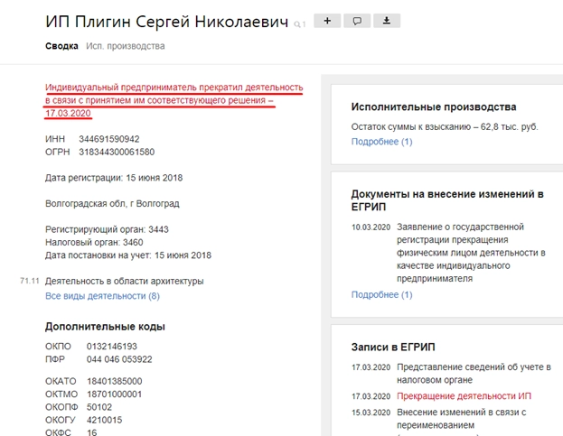 На самом деле, согласно базе «Контур.Фокус», индивидуальный предприниматель Плигин Сергей Николаевич, ведущий деятельность в области архитектуры, прекратил свою деятельность еще 17 марта 2020 г. А заявление о прекращении деятельности ИП он подал еще 10 марта 2020 года.