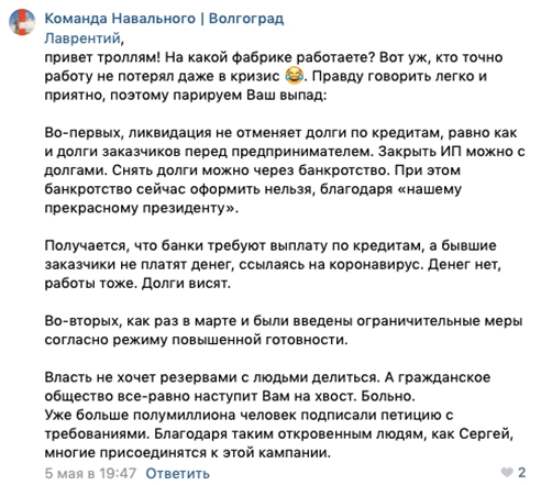 Таким образом, бизнес Плигина был закрыт еще до начала эпидемии в России — и это никак не связано с введенными ограничительными мерами. Когда на этот факт указали в комментариях, команда Навального начала рассказывать о «троллях» и «фабриках».
