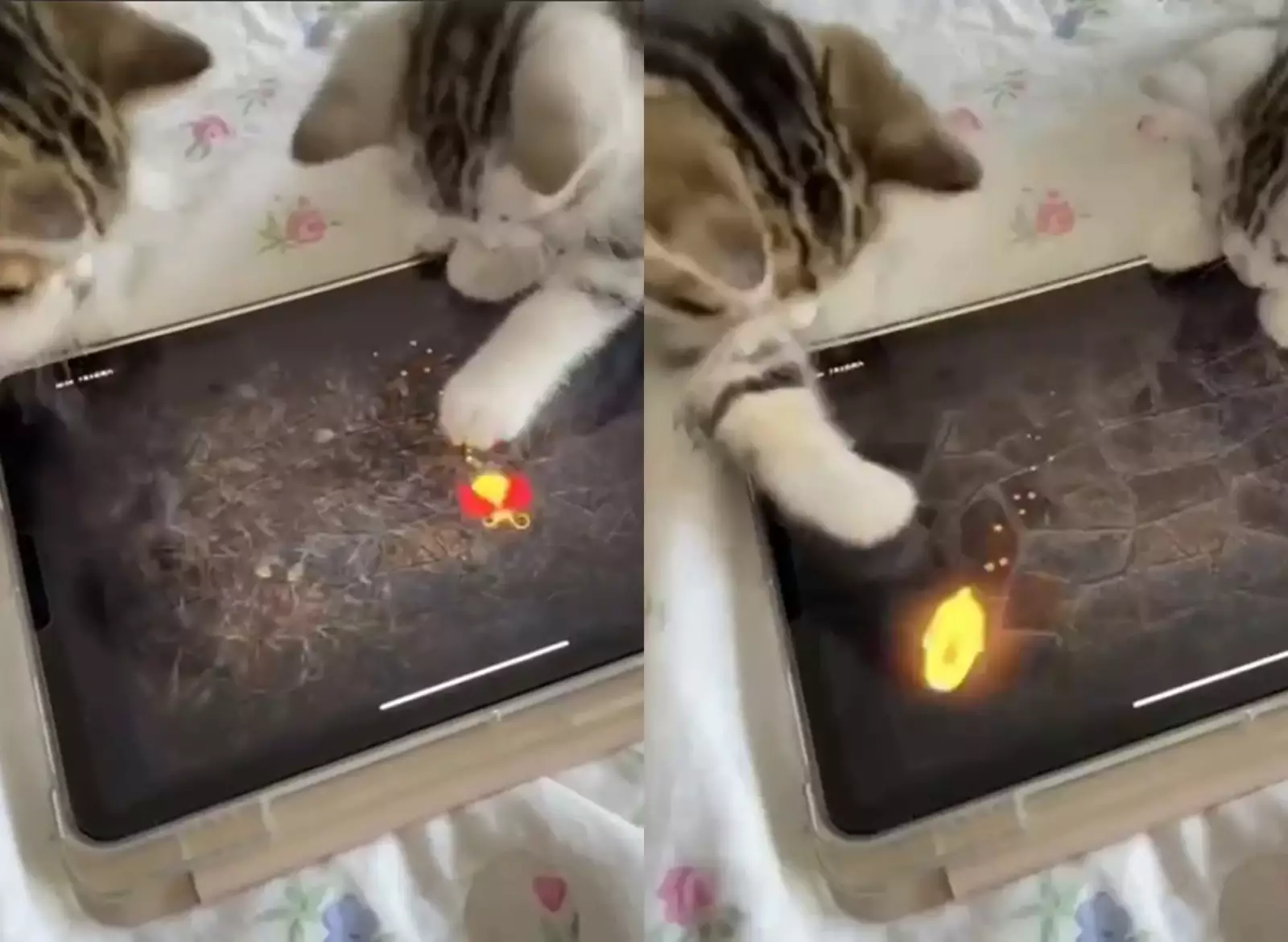 На видео попала командная игра двух пушистых: они охотятся на виртуальных светлячков и, надо признать, делают это весьма неплохо.