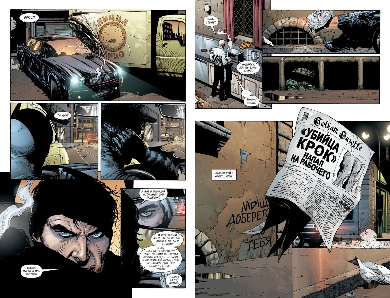 Бандитское отребье между уже сочиняет о Бэтмене зловещие байки («Говорят, если его назовешь по имени, он сразу явится»), пугающие особенно нервных настолько, что умоляющий крик раздается из их уст при его появлении: «Только не пей мою кровь!» «Мышь доберется до тебя», — гласит граффити на стене, свидетельствуя о том, что героем в маске выбрано в целом верное направление.