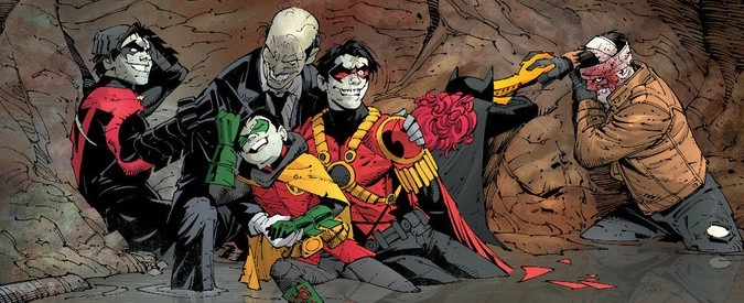 «На этот раз Джокер хочет истребить нас всех, да? — уточняет Найтвинг. — Семейное дело?» Но в том-то и суть, что Бэтмен по натуре своей — одиночка и по-прежнему не готов делить хоть с кем-то свои заботы и переживания. «Отец, ты не можешь нас постоянно опекать. Мы хотим сражаться за тебя», — бесстрашно уверяет поддерживаемый всей командой малыш, но угрюмый взрослый решительно стоит на своём. «У тебя секреты от нас, но не от него», — справедливо полагают подростки, и Джокер, ставший по замыслу нового автора в чём-то похожим на Питера Пэна, это подозрение умело использует в своих целях: