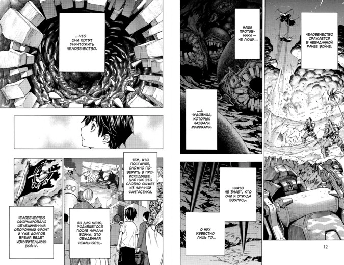 Начнём снова. В 2004-м году в Японии было опубликовано ранобэ Хироси Сакурадзака с рисунками ёситоси АБэ под англоязычным названием «All you need is kill»; впоследствии оно было переиздано в США как «Грань будущего». Спустя десять лет мир увидел экранизацию романа в постановке Дага Лаймана и с Томом Крузом в главной роли. Выход картины на экраны предварила адаптация книги в мангу в семнадцати выпусках, которые позднее были объединены в два тома (раскадровка текста Рёскэ Такэути, художник Такэси Обата). Фильм если не все, то многие видели, оригинальный роман, быть может, тоже кто-то да прочитал — а вот теперь на русском вышла и эта самая манга, заголовок которой объединил оба названия: «All you need is kill. Грань будущего».
