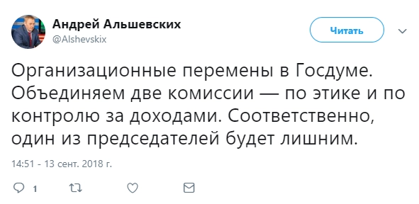 Объединение комиссий он назвал «организационными переменами» в Госдуме, после чего «один из председателей будет лишним».