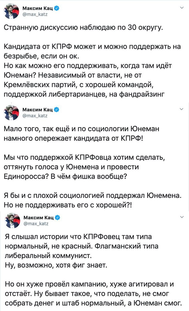 На нелогичный подход создателей «Умного голосования» обратили внимание и представители оппозиции: «Роман Юнеман ведет очень крутую кампанию, с публичным сбором средств, классными агитаторами — именно такими кампании и должны быть, по социологии Юнеман сейчас вообще лидирует, обгоняя единоросса и имеет шансы на мандат. К сожалению, «Умное голосование» тут собирается призвать голосовать за Жуковского от КПРФ, который отстает и от Юнемана, и от единоросски, это может растянуть голоса и привести к потере мандата тут», — считает Максим Кац.