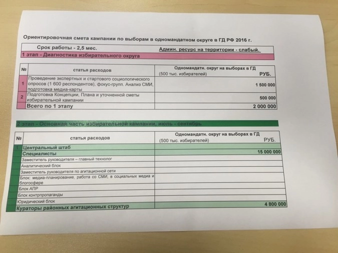 «Сразу скажу, что сам я по идейным взглядам коммунист и давно являюсь членом партии «Коммунисты России». По своим идейным убеждениям я считаю, что коммунистом должен быть человек порядочный и честный, в отличие от многих представителей других партий, которые приходят в политику не по зову сердца, а ради наживы. В силу своей политической деятельности и приверженности коммунистическим взглядам, я иногда бываю на мероприятиях КПРФ. На этот раз при посещении офиса первого секретаря Московского горкома КПРФ Валерия Рашкина мне попался на глаза один документ (не буду вдаваться в подробности при каких обстоятельствах, считаю неуместным рассказывать всю внутреннюю кухню). В общем, мне удалось сделать несколько фотографий одного показавшегося мне интересным документа: это ориентировочная смета «кампании по выборам в одномандатном округе в ГД РФ 2016 года», — заявил автор поста.