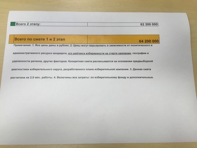 В документе со стола Рашкина сказано, что КПРФ собирается потратить на предвыборную кампанию в одном одномандатном округе 64 миллиона 200 тысяч рублей.