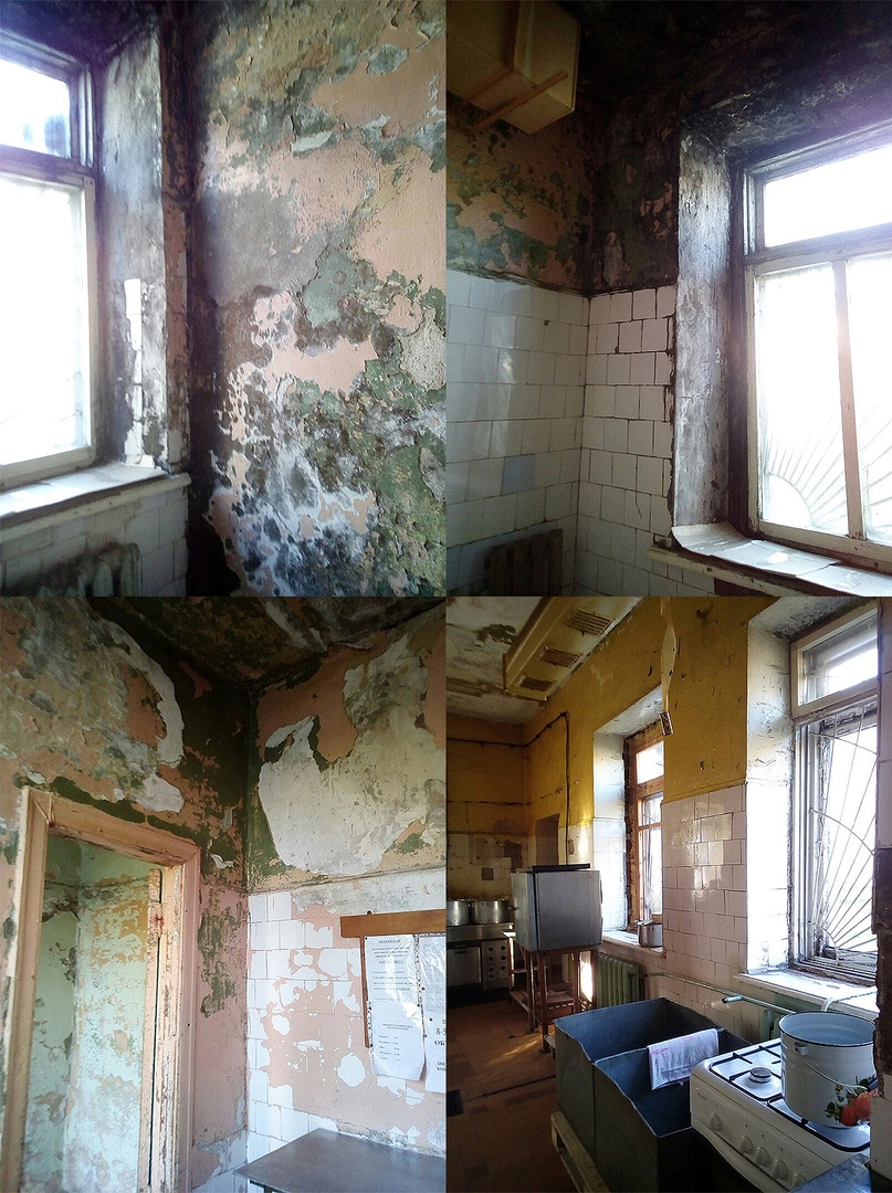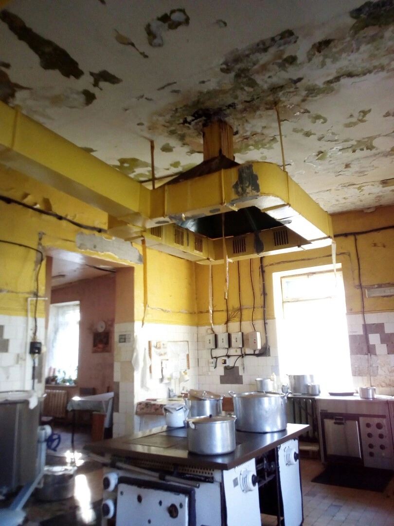 Судя по этим кадрам, в помещении обшарпанные стены и потолок. Также в пищеблоке газовая плита и столовые принадлежности времен СССР.