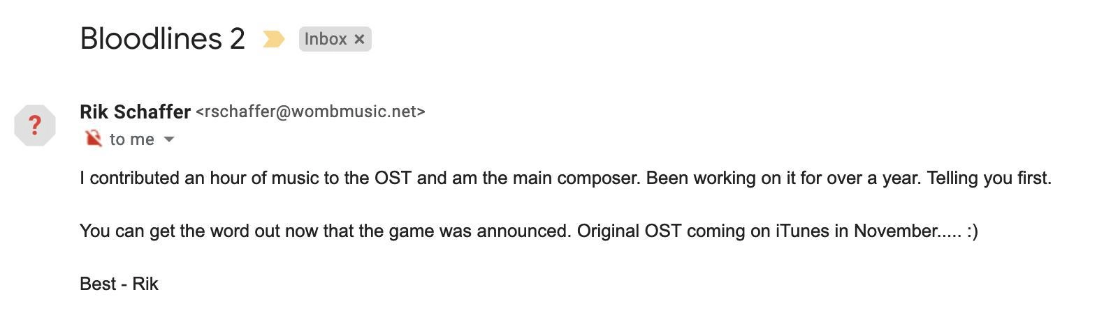 Среди взволнованных был разработчик игр и стример Outstar, который связался с Шаффером, чтобы спросить, участвует ли он в «Bloodlines 2». Композитор обрадовал: «Я посвятил час музыки для саундтрека и являюсь основным композитором. Работаю над ним уже больше года».