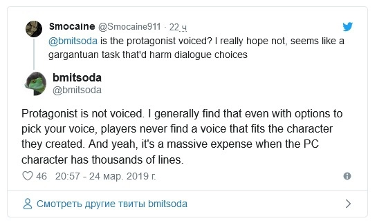 «Протагонист не озвучен. Я обычно замечаю, что даже при наличии нескольких вариантов голоса игроки не могут подобрать такой, который подходил бы созданному ими персонажу. И да, это огромные затраты, если персонаж игрока обладает многими тысячами строк [диалогов]».