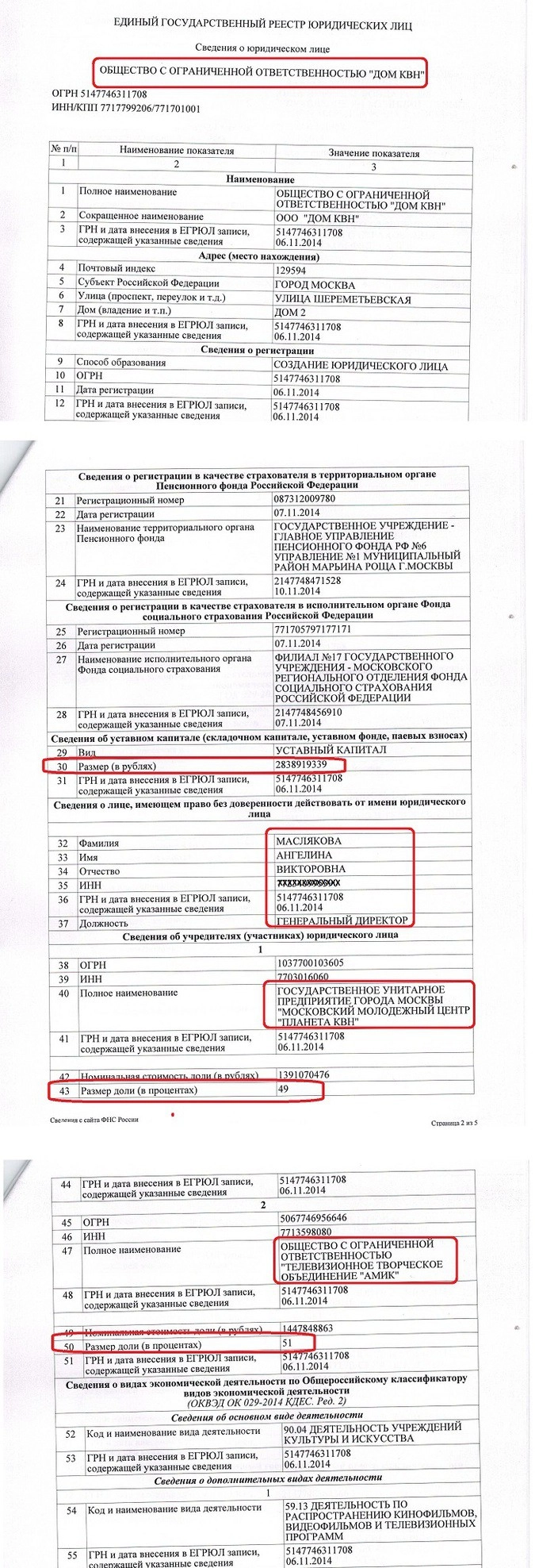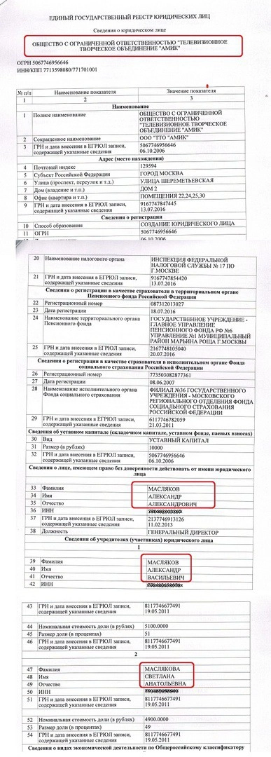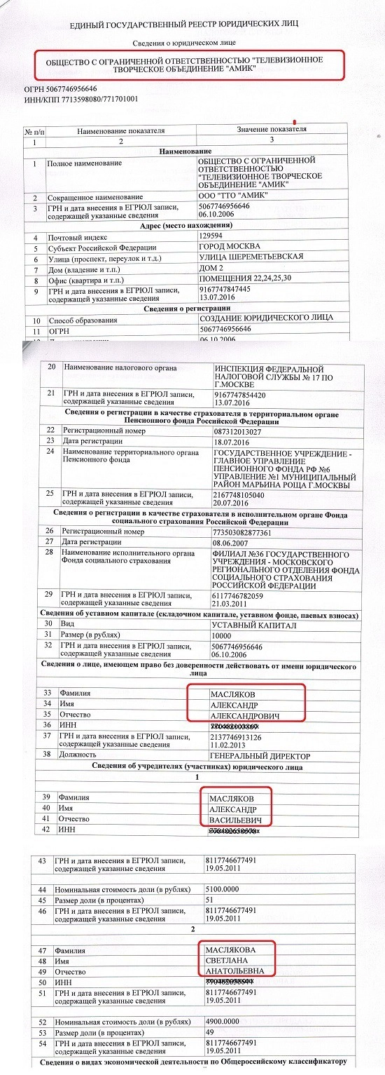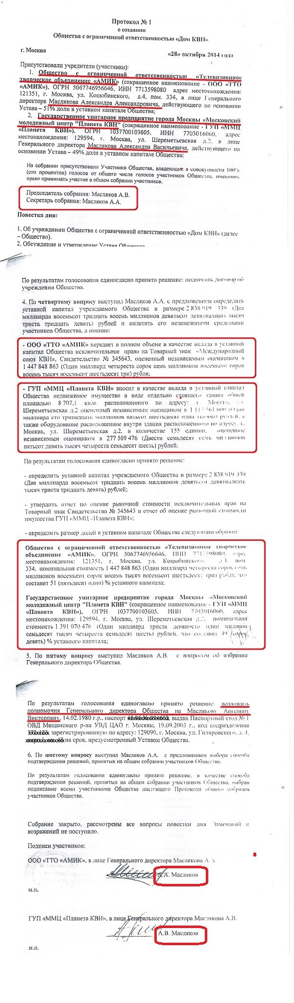 ООО «ТТО АМИК» получает 51 процент уставного капитала ООО «Дом КВН». И подписывают это счастье со стороны государства (Государственное унитарное предприятие «ММЦ Планета КВН») гендиректор Александр Масляков-папа, а со стороны частного ООО «ТТО АМИК» — гендиректор Александр Масляков-сын. Не верите? Смотрите сами: