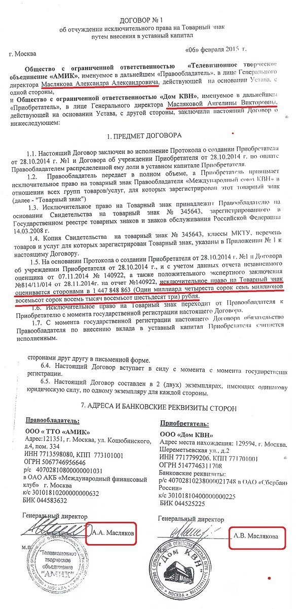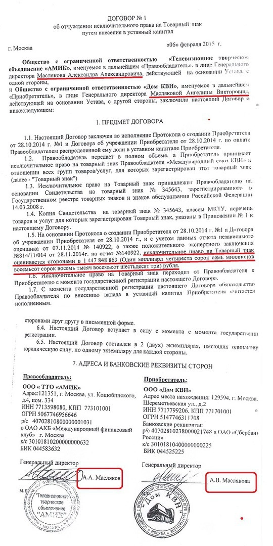 А вот и договор о передаче того самого «товарного знака КВН», оцененного в целых 36 миллионов долларов, из ООО «ТТО АМИК» в новоявленное ООО «Дом КВН», по-семейному подписанный мужем и женой — гендиректором Александром Масляковым и гендиректором Ангелиной Масляковой: