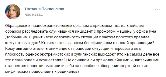 До этого адвокат Констанин Добрынин, сообщивший о поджоге, утверждал, что депутату грозит лишение мандата из-за «искусственной истерии», связанной с «Матильдой».