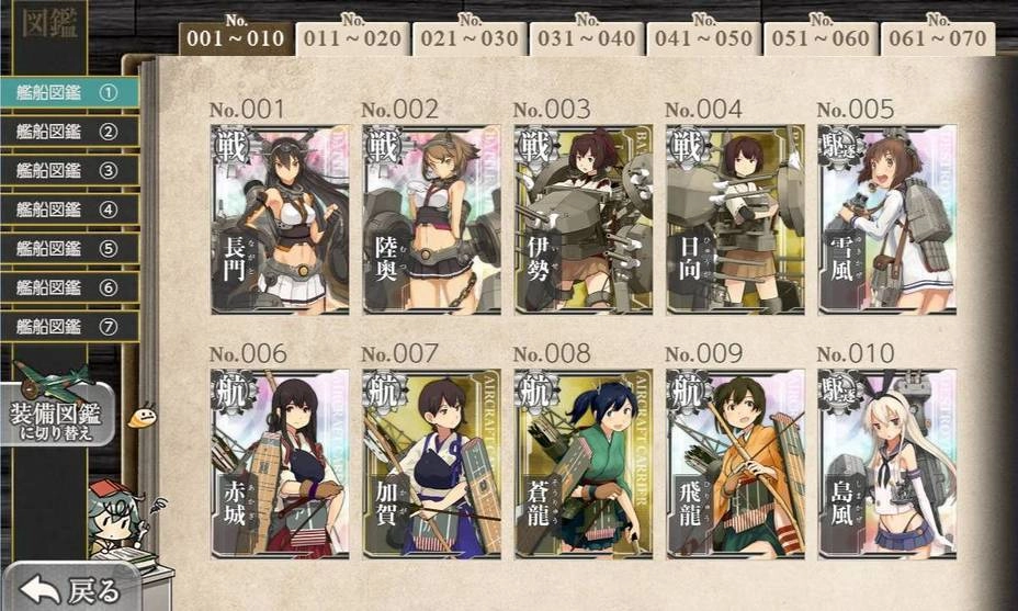 Одна из страниц игрового каталога с некоторыми из японских кораблей. Представлены линкоры Нагато, Муцу, Исэ, Хьюга; тяжёлые авианосцы Акаги, Кага, Хирю, Сорю; эсминцы Юкикадзе и Симакадзе.