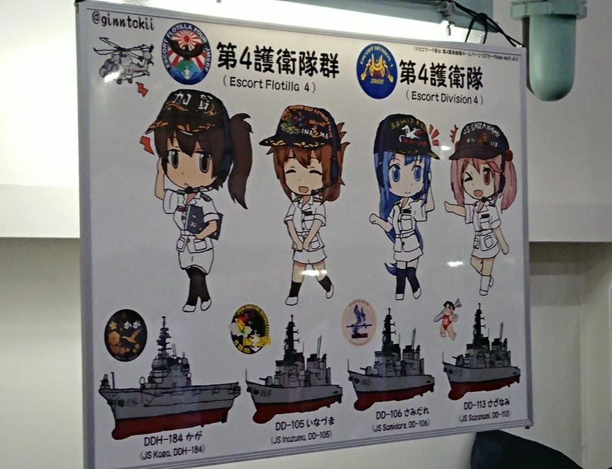 Неофициальные маскоты кораблей 4-й эскортной флотилии: вертолётоносец Kaga (снимок сделан на борту корабля), эсминцы Inazuma, Samidare и Sazanami
