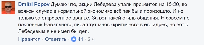Победить можно только вместе. Бесконечные наезды Алексея на всех вокруг себя, нетерпимость к критике и постоянный переход на личности — плохой путь к победе. <…> Думаю, с точки зрения чистоты доходов Лебедев-то попрозрачнее Навального будет. Это не наезд на Лешу, а констатация факта.
