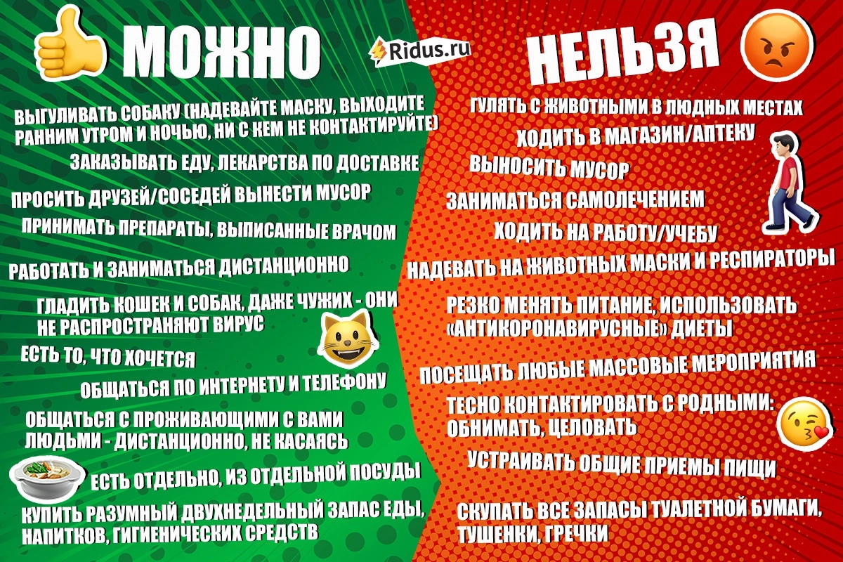 Про самоизоляцию — то есть, добровольный домашний карантин — написал уже не один десяток экспертов. Мы свели их рекомендации в удобную и понятную табличку: если вы не знаете, как правильно организовать комфортное двухнедельное пребывание в домашних стенах, она вам поможет.