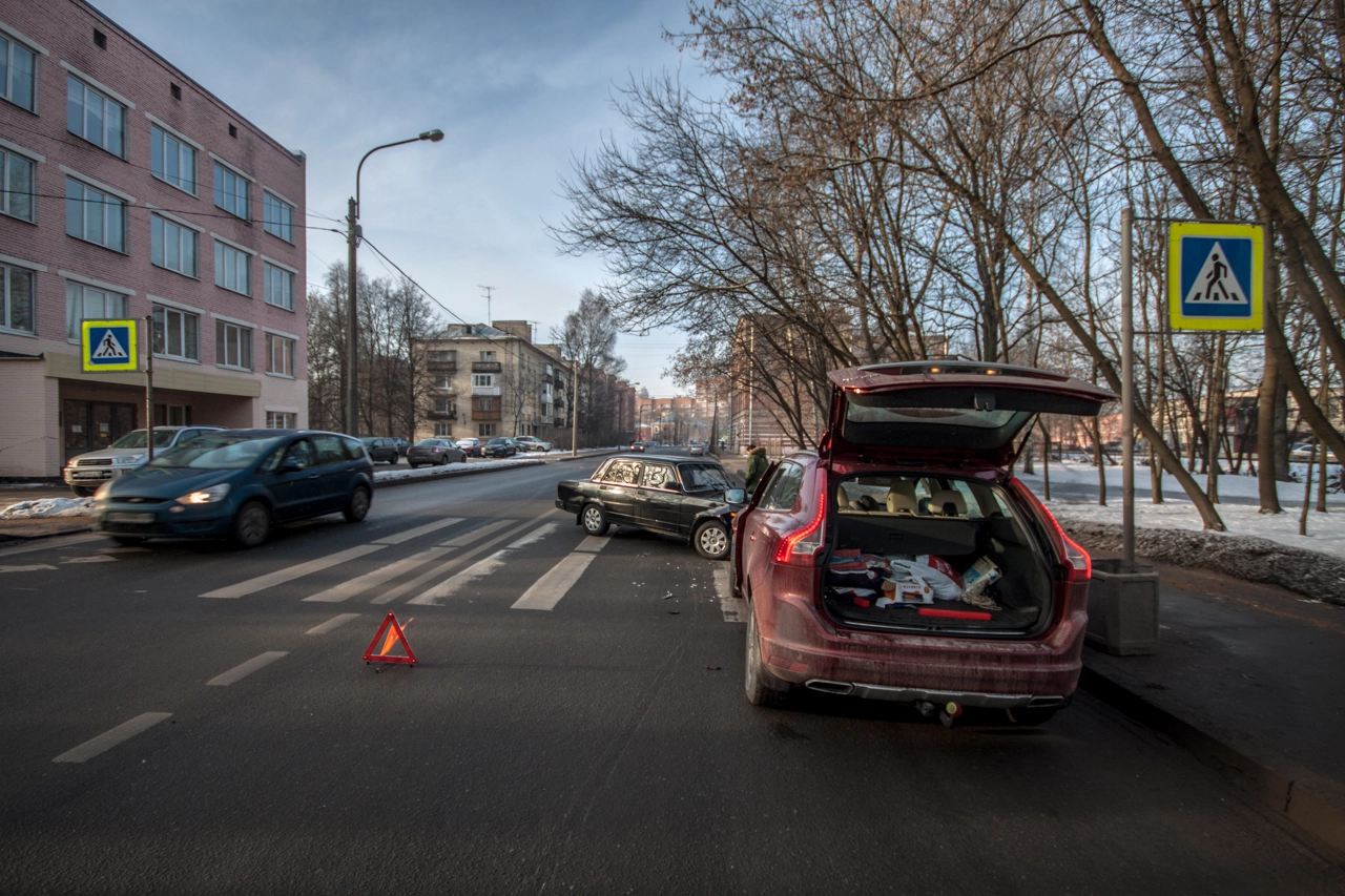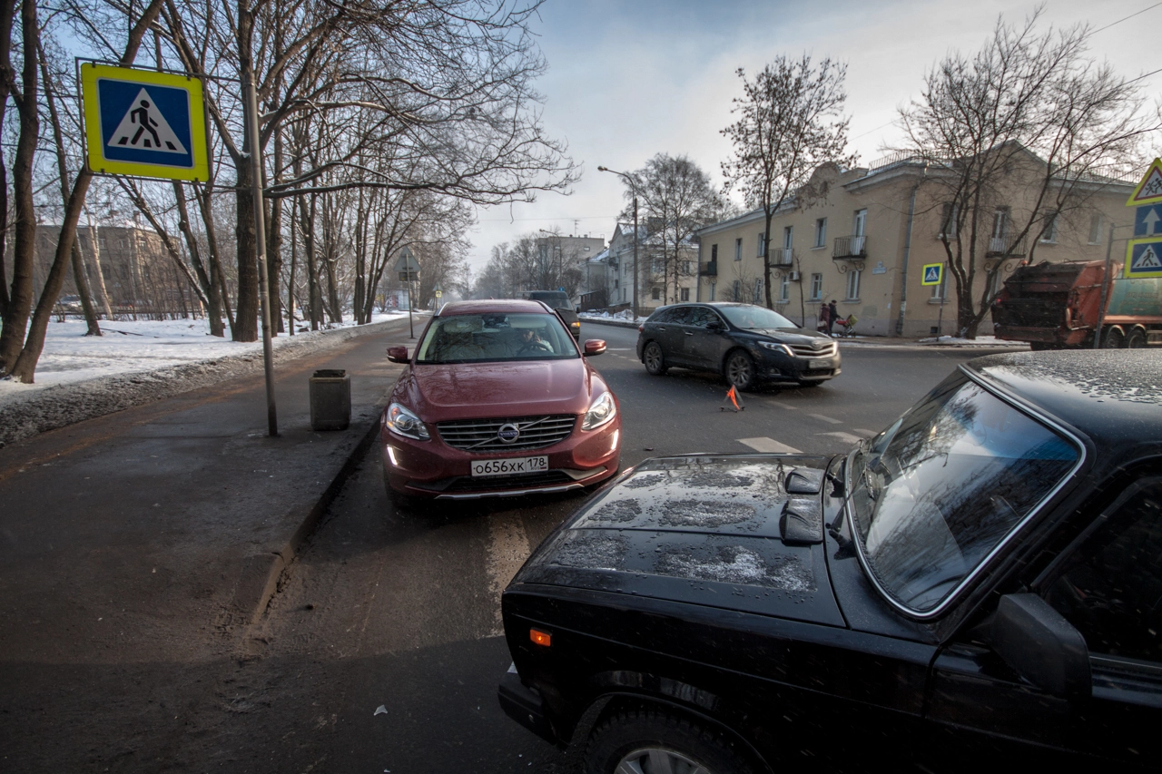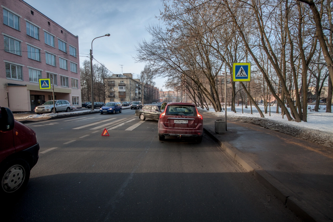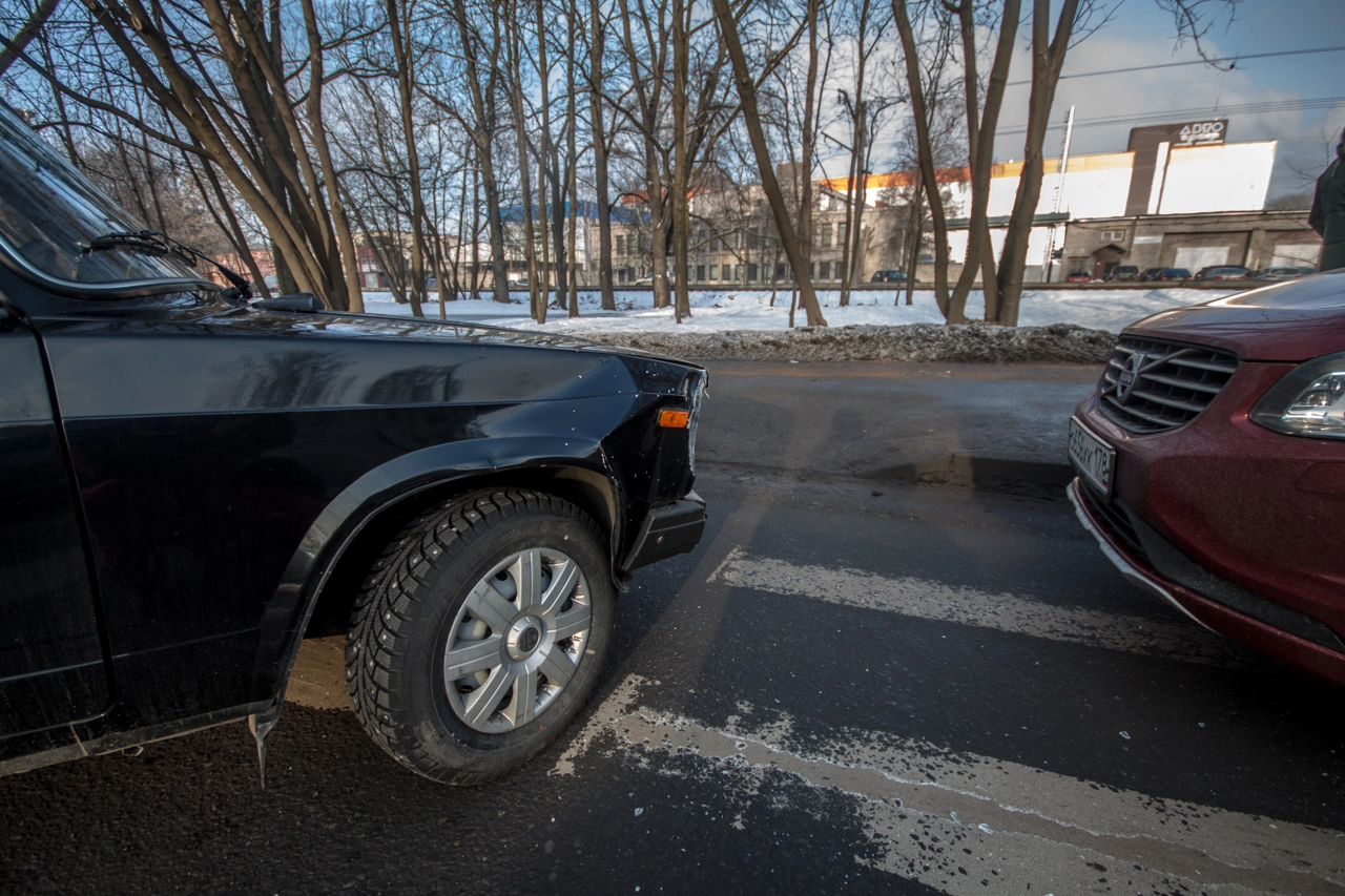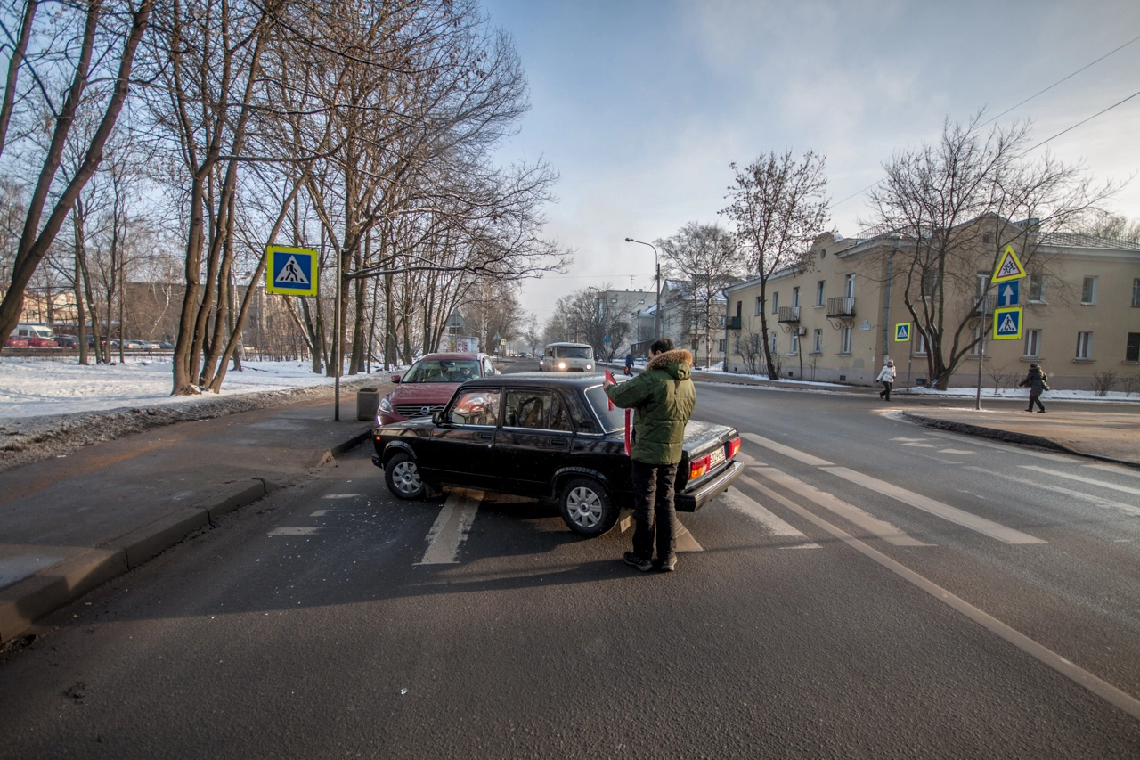 Со слов пешехода: «Собираюсь переходить проезжую часть по нерегулируемому пешеходному переходу. Убедился в том, что приоритет мне предоставляет а\м марки „Вольво“, двигавшаяся до этого по правому ряду Школьной ул. (дело происходило в Санкт-Петербурге — прим. „Ридус“), помню, что согласно последним поправкам к ПДД её никто не должен опережать не убедившись в отсутствии пешеходов, но выходя на проезжую часть я внимательно смотрю налево. А\м следующая во втором ряду снижает скорость перед п\п, но не останавливается, а проезжает дальше. Следующие за ней „Жигули“ находятся на достаточном расстоянии для торможения, и я нахожусь в поле зрения водителя, так что я делаю ещё шаг, но вижу, что водитель слишком поздно применил торможение и машина не сможет остановится до пешеходного перехода, так как пошла в занос на шипах. Финальную роль, как мне кажется, сыграла разметка пешеходного перехода, на которую водитель наехал левым колесом, из-за чего автомобиль без АБС начало разворачивать вправо, после чего он зацепил стоящую „Вольво“ и довернул в сторону меня. Глазомер, ловкость и постоянные занятия спортом спасли меня от травм и позволили увернутся от приехавшего на моё место автомобиля».