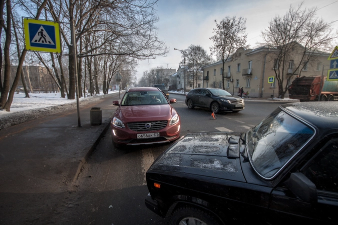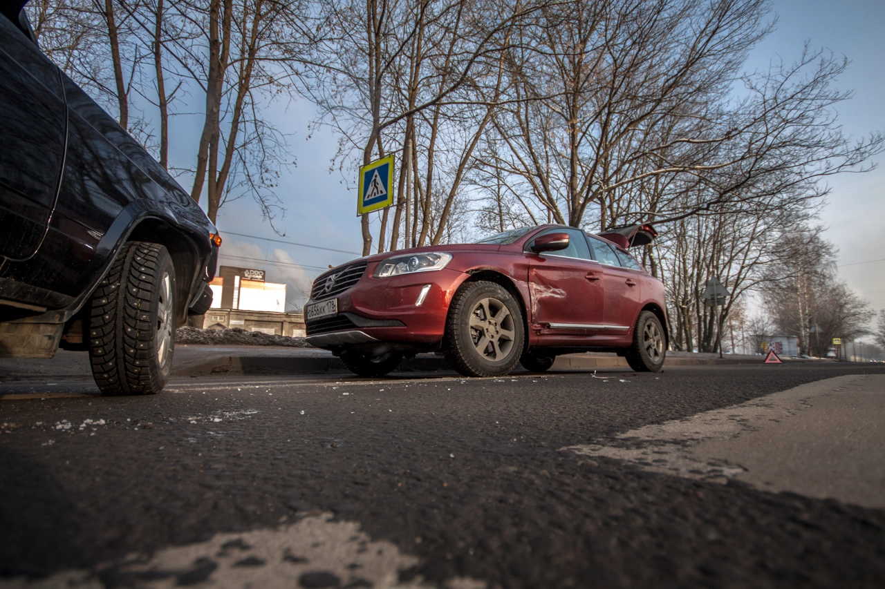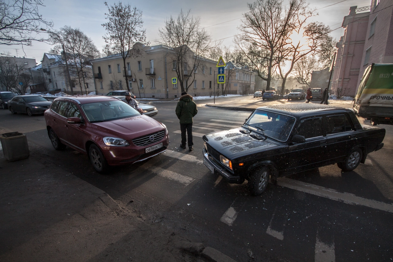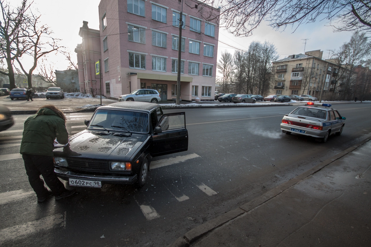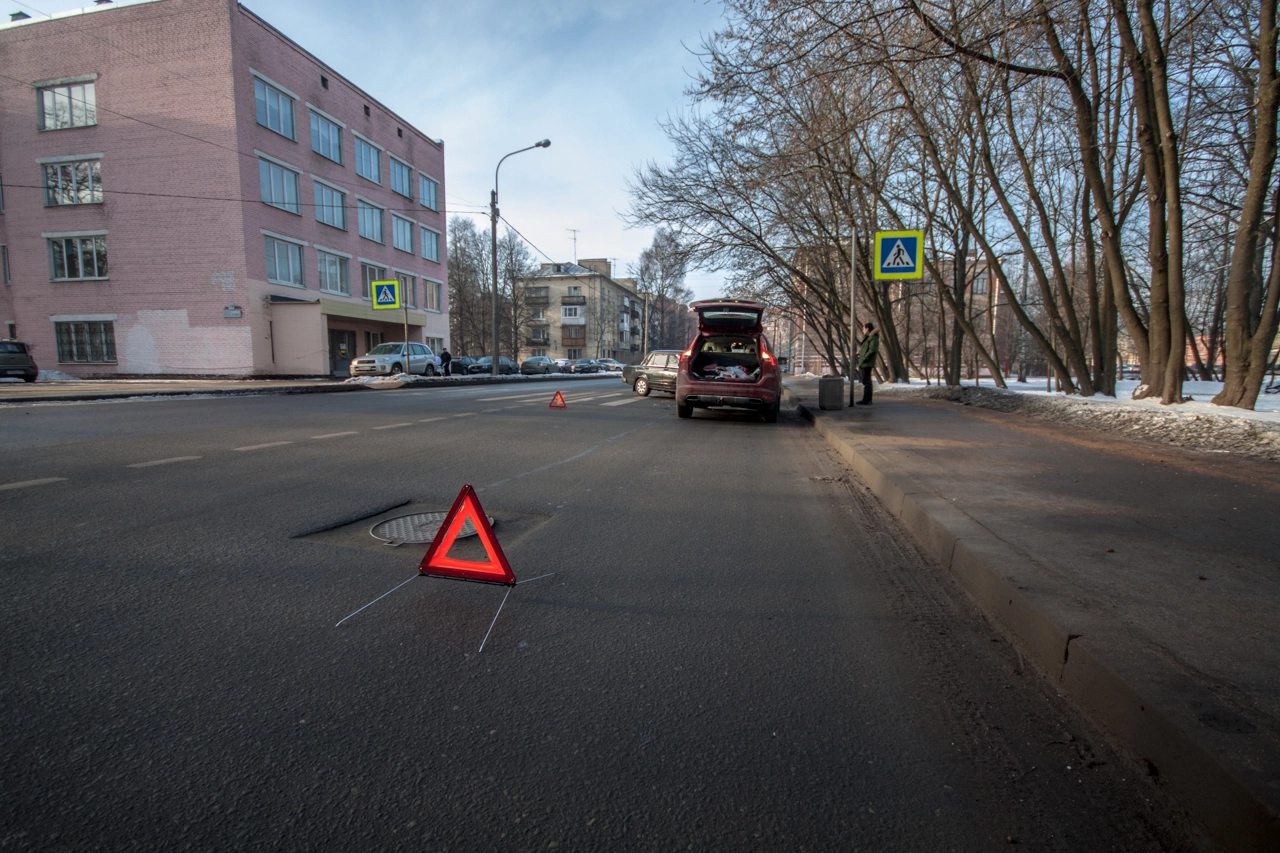 Со слов пешехода: «Собираюсь переходить проезжую часть по нерегулируемому пешеходному переходу. Убедился в том, что приоритет мне предоставляет а\м марки „Вольво“, двигавшаяся до этого по правому ряду Школьной ул. (дело происходило в Санкт-Петербурге — прим. „Ридус“), помню, что согласно последним поправкам к ПДД её никто не должен опережать не убедившись в отсутствии пешеходов, но выходя на проезжую часть я внимательно смотрю налево. А\м следующая во втором ряду снижает скорость перед п\п, но не останавливается, а проезжает дальше. Следующие за ней „Жигули“ находятся на достаточном расстоянии для торможения, и я нахожусь в поле зрения водителя, так что я делаю ещё шаг, но вижу, что водитель слишком поздно применил торможение и машина не сможет остановится до пешеходного перехода, так как пошла в занос на шипах. Финальную роль, как мне кажется, сыграла разметка пешеходного перехода, на которую водитель наехал левым колесом, из-за чего автомобиль без АБС начало разворачивать вправо, после чего он зацепил стоящую „Вольво“ и довернул в сторону меня. Глазомер, ловкость и постоянные занятия спортом спасли меня от травм и позволили увернутся от приехавшего на моё место автомобиля».