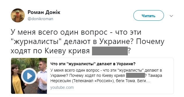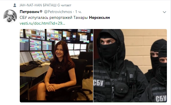 «Какого … в Украине свободно чувствует себя журналистка „Россия-1“ Тамара Нерсесьян? Снимает сюжеты, пишет стендапы напротив центрального входа в киевскую мэрию. Мы этого так не оставим. Русофобия так русофобия. Выдворение журналистки — реакция властей на „общественное мнение“. Ну, и наказание за „очернение“ новых украинских героев».