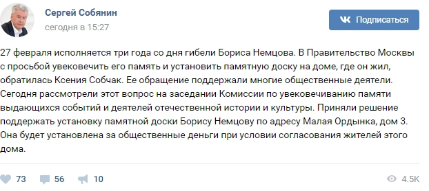 В Москве установят памятную доску убитому в 2015 году политику Борису Немцову. Об этом сообщил мэр столицы Сергей Собянин.
