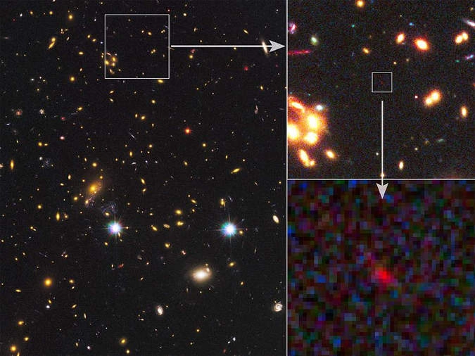 Анализируя снимки скопления галактик MACS J1149+2223, исследователи обнаружили тусклый объект, который при детальном изучении оказался галактикой. Ее красное смещение оказалось равным 9,6, что соответствует возрасту около 13,2 миллиарда лет. Предположительно, это самая удаленная галактика из когда-либо наблюдавшихся человеком.