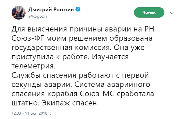 Авария с ракетой-носителем «Союз-ФГ» вызвала возмущение интернет-пользователей. Твиты главы Роскосмоса Дмитрия Рогозина, рассказывающего о ситуации, набрали сотни комментариев.