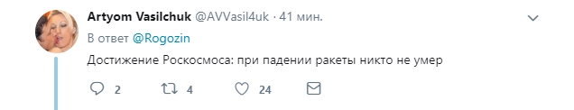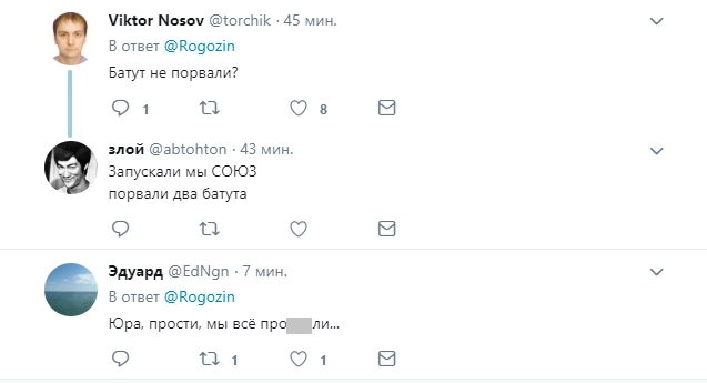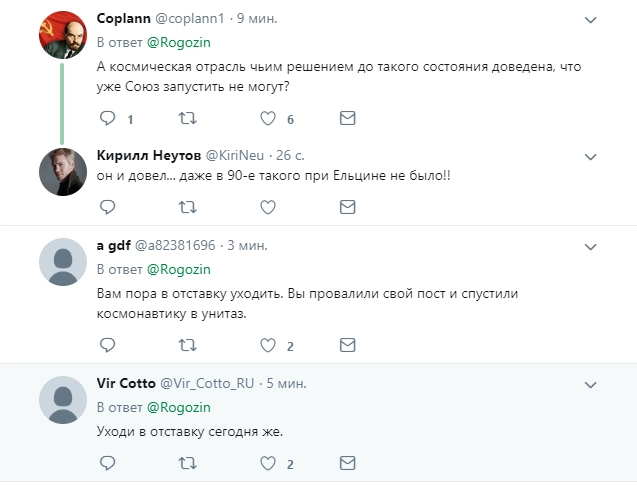 «Дмитрий Олегович, что за… (ерунда)? У нас то „Союзы“ просверленные, то ракеты падают», «Дмитрий Олегович, не пора ли вернуть Роскосмос военным? Невозможно это смотреть и читать. Ну позорище!» — негодуют пользователи.