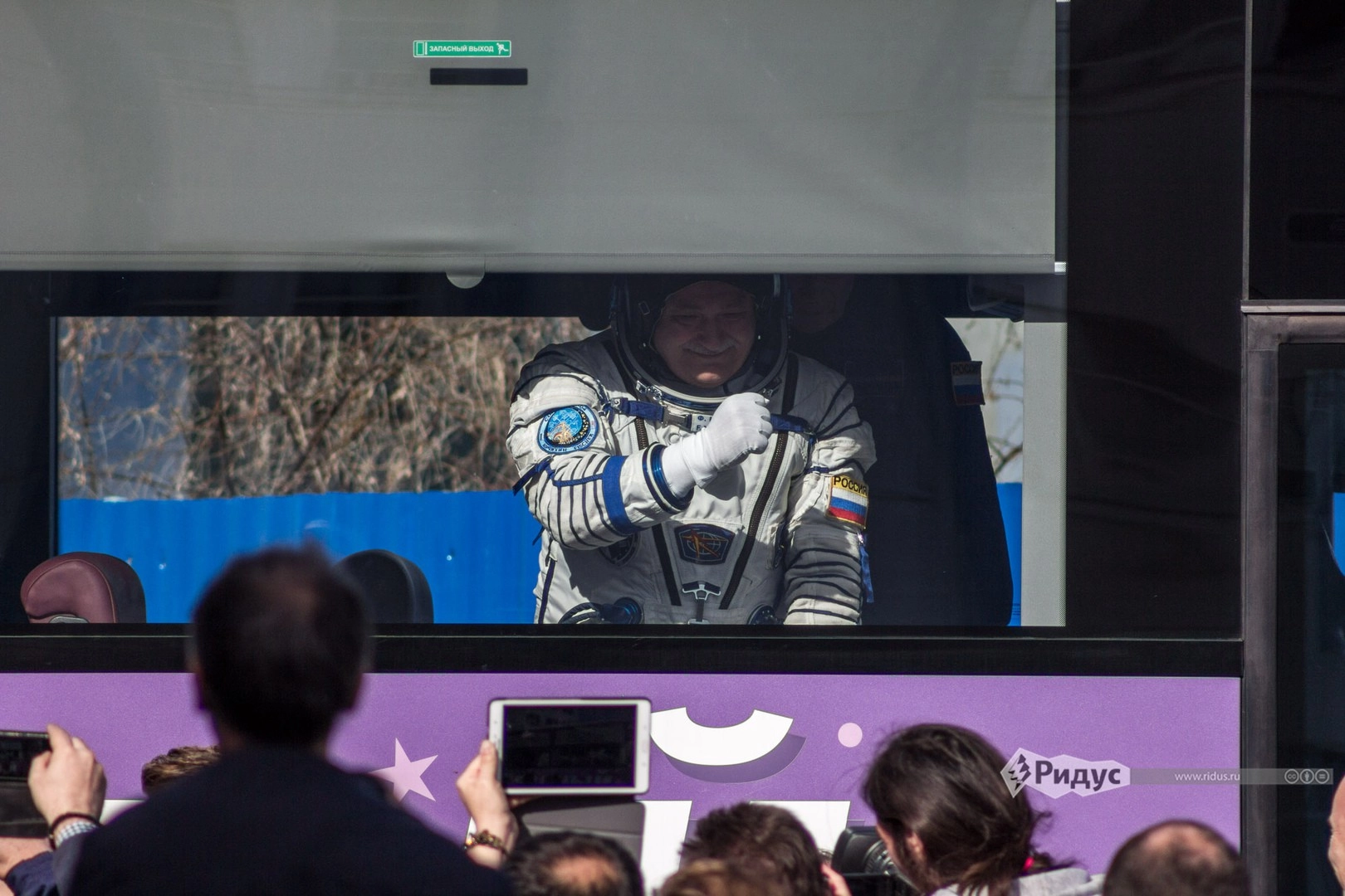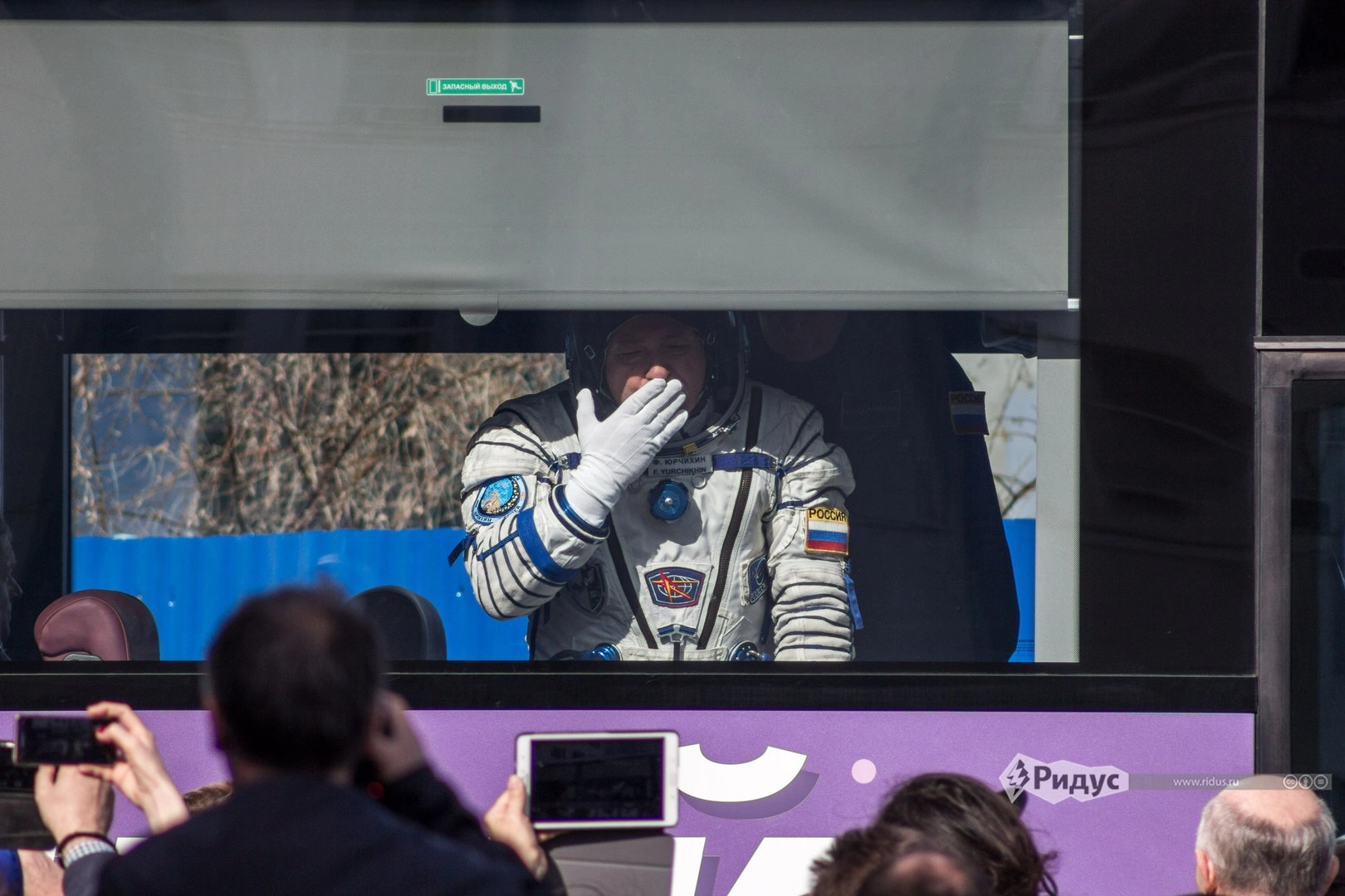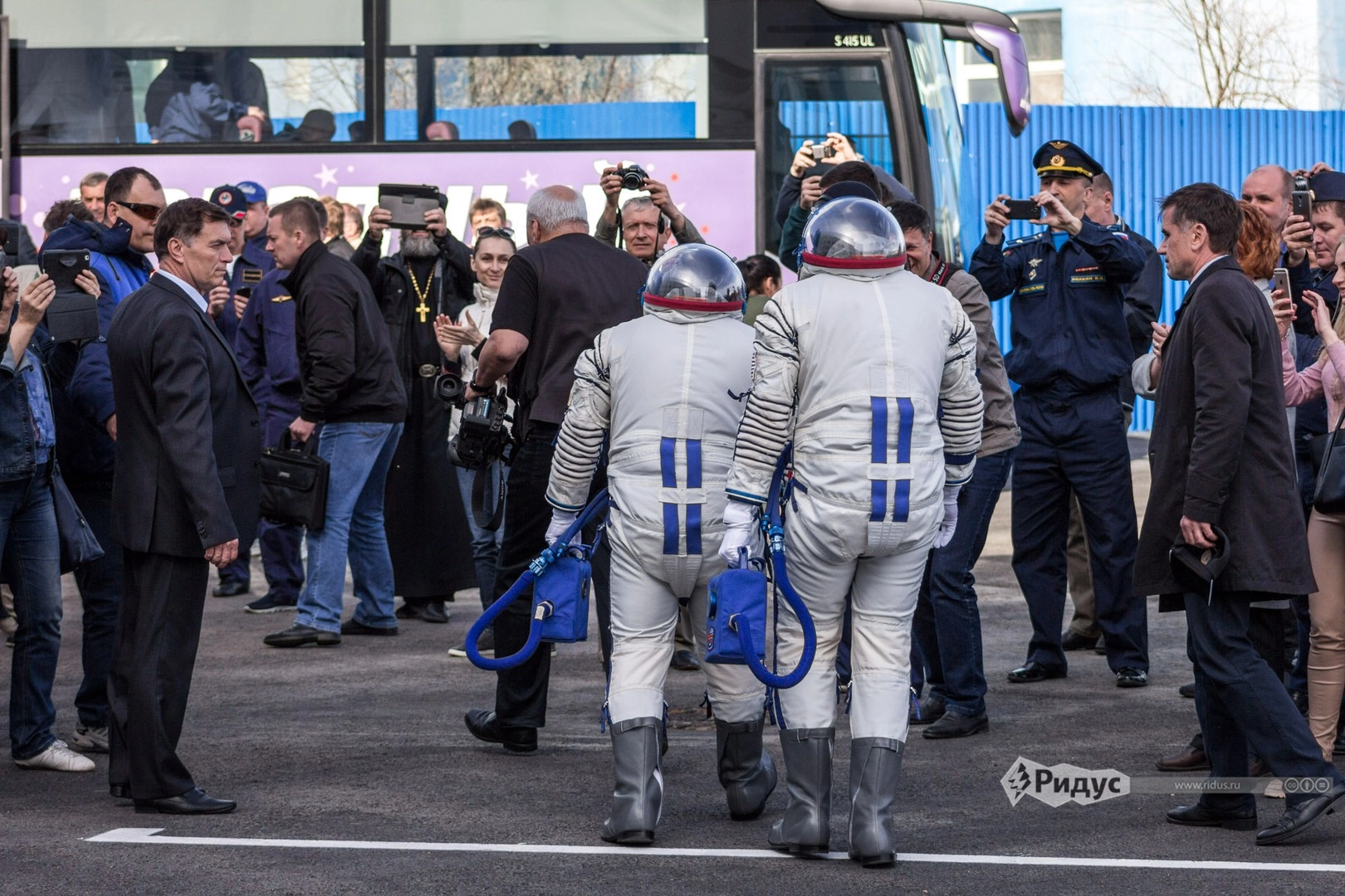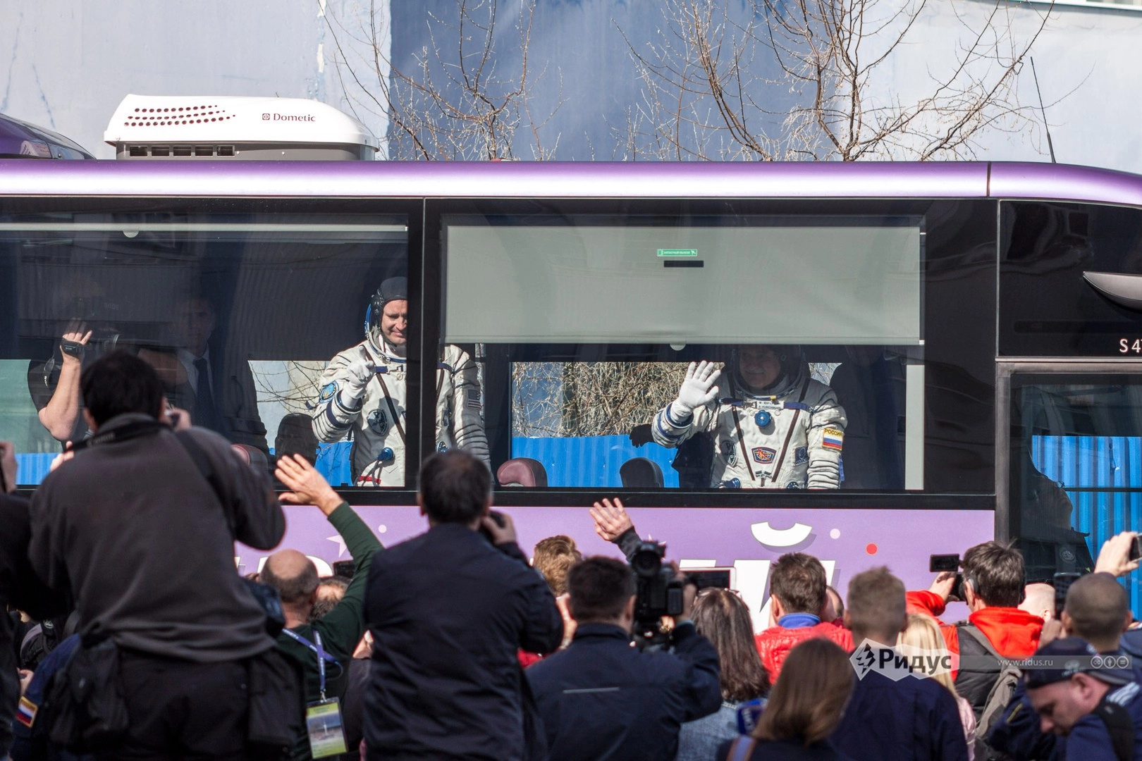 Возле гостиницы космонавтов и их дублеров ждали два автобуса — «Байконур» и «Звёздный», возле которых стояли представители СМИ, провожающие и семьи.