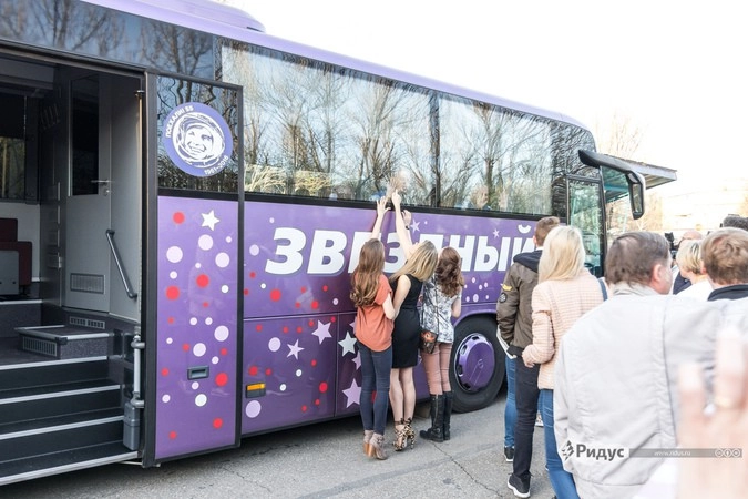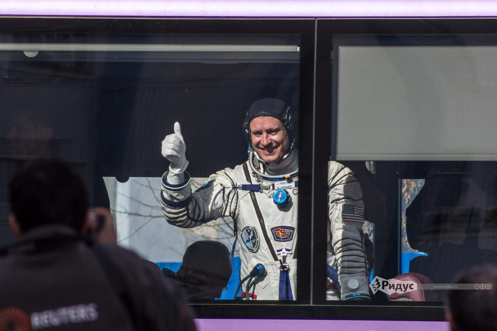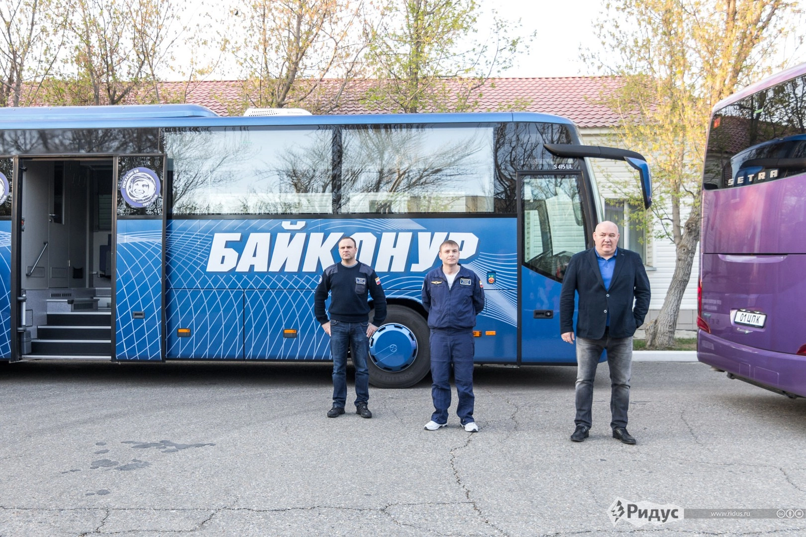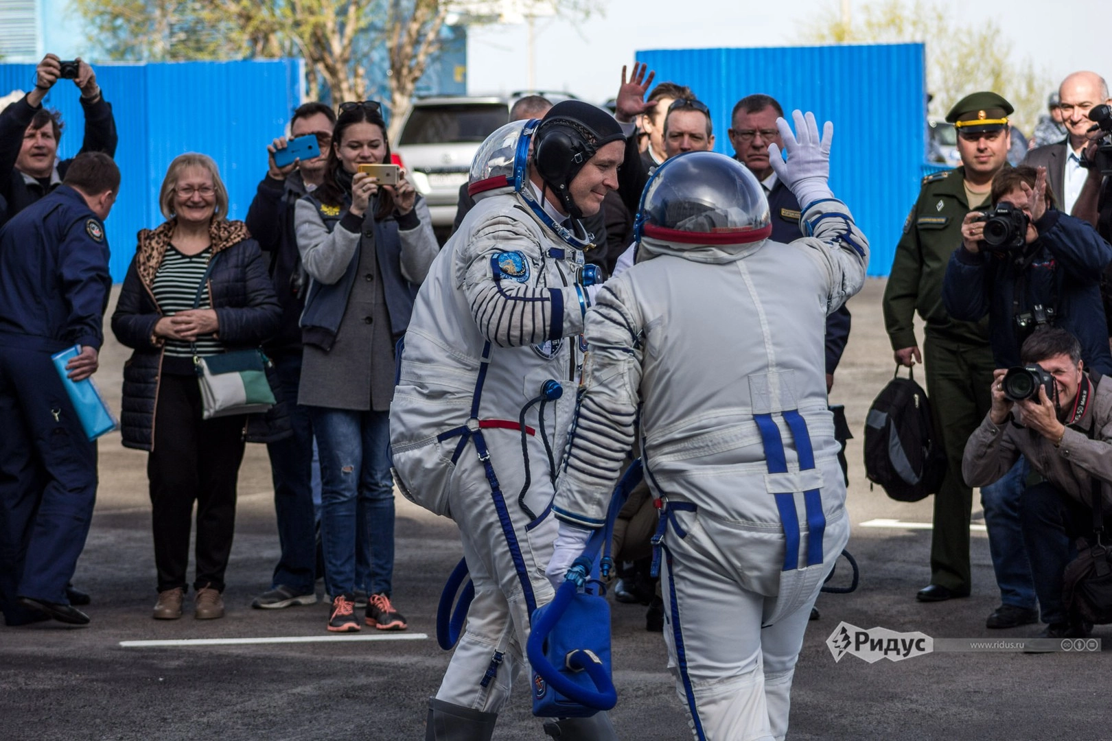 Возле гостиницы космонавтов и их дублеров ждали два автобуса — «Байконур» и «Звёздный», возле которых стояли представители СМИ, провожающие и семьи.