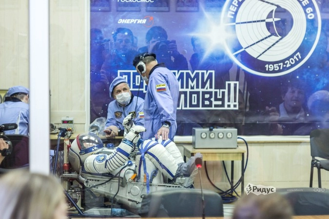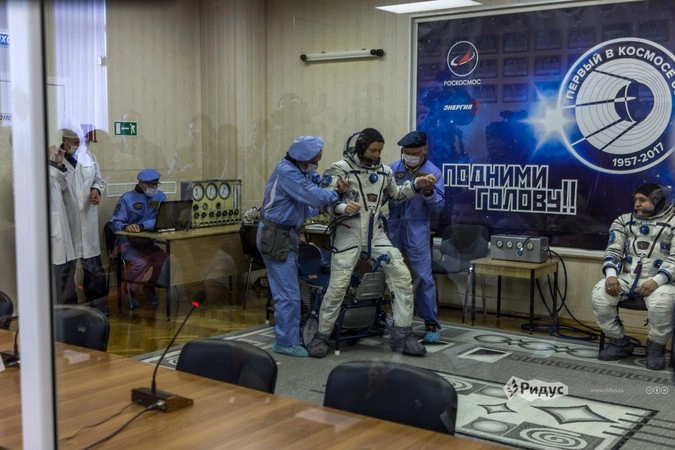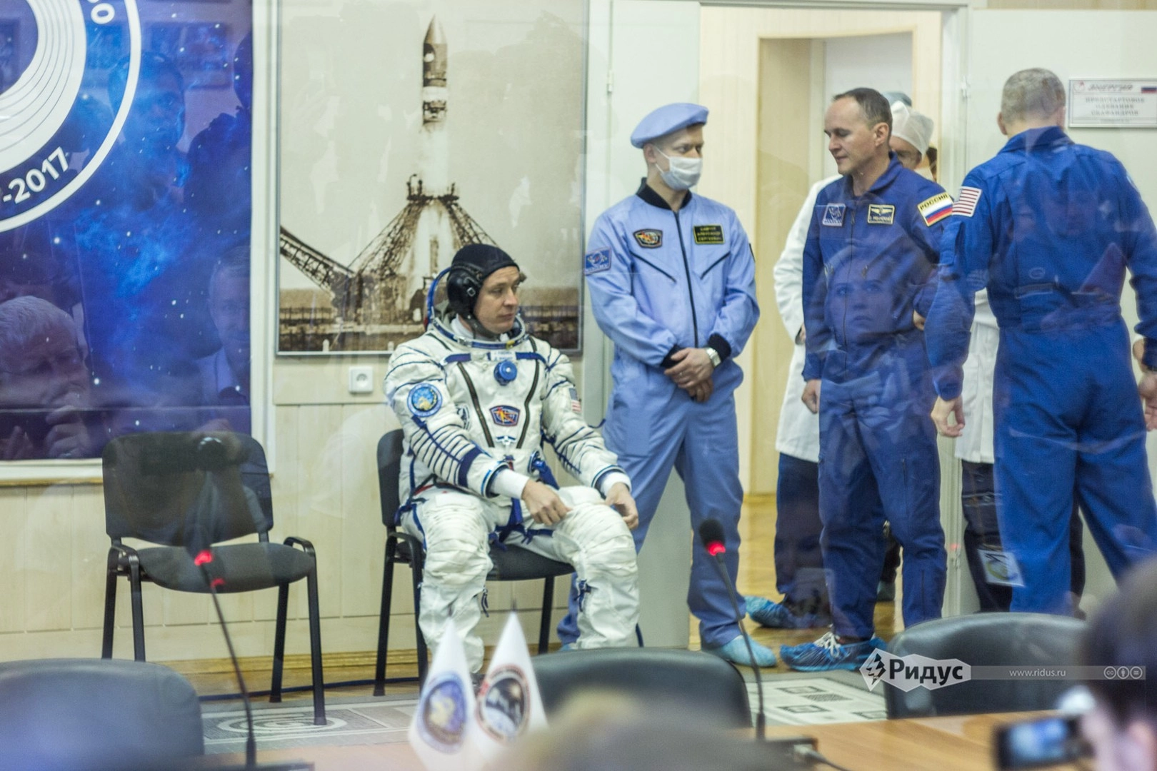 Происходит это действо в большом зале за стеклом, по одну сторону которого находятся представители СМИ и родственники космонавтов, а по другую сами космонавты и сотрудники космодрома.