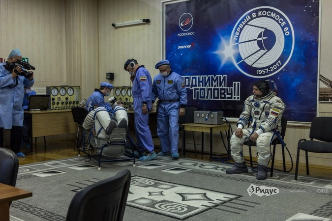 Еще одно важное мероприятие — примерка космонавтами скафандров и проверка работоспособности всех систем.