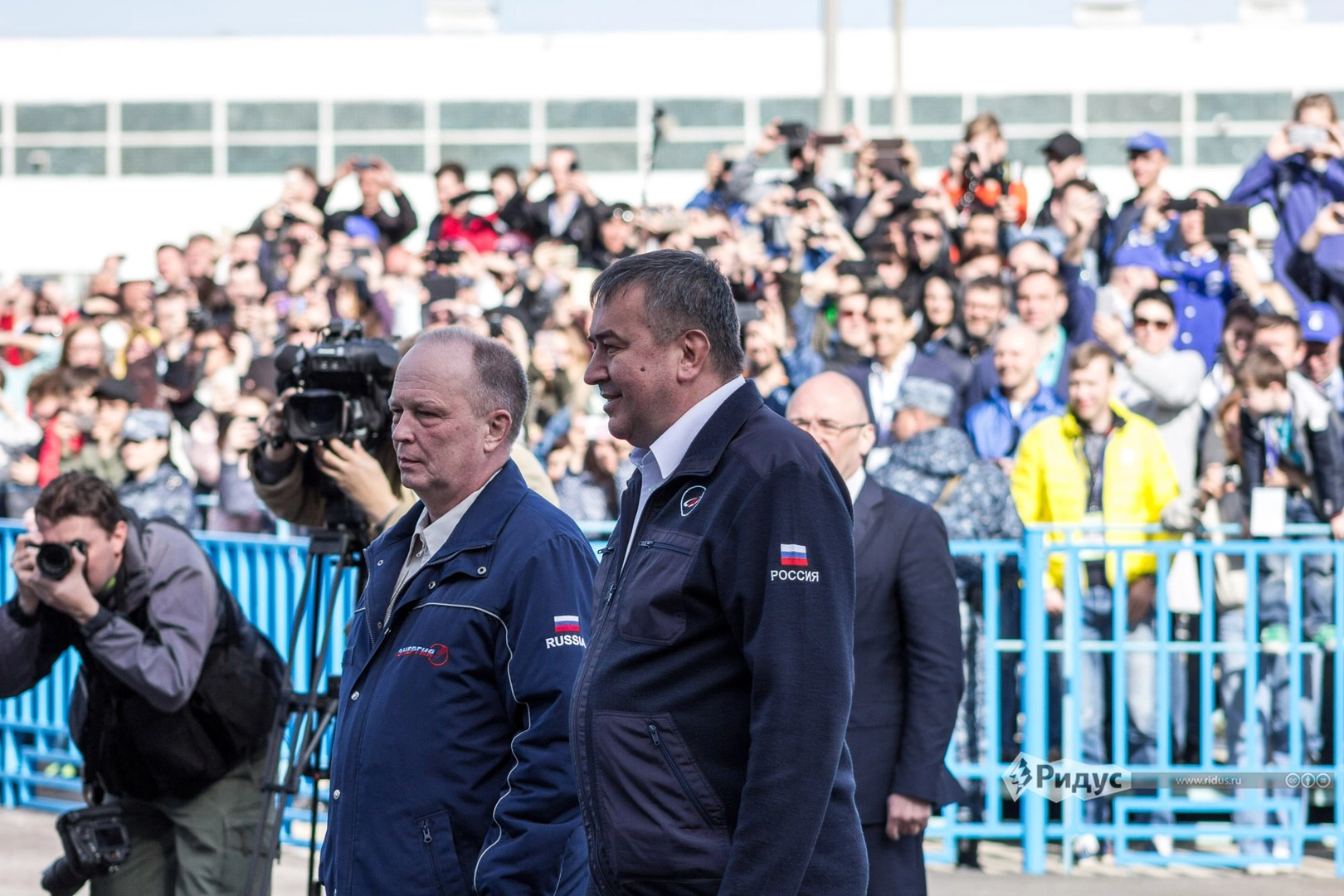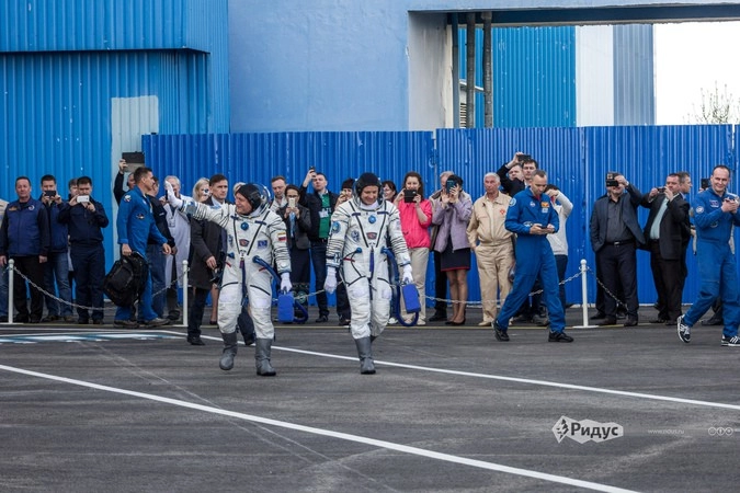 Примерка и проверка длятся примерно несколько секунд, после чего космонавтов выводят на улицу для небольшой официальной части.