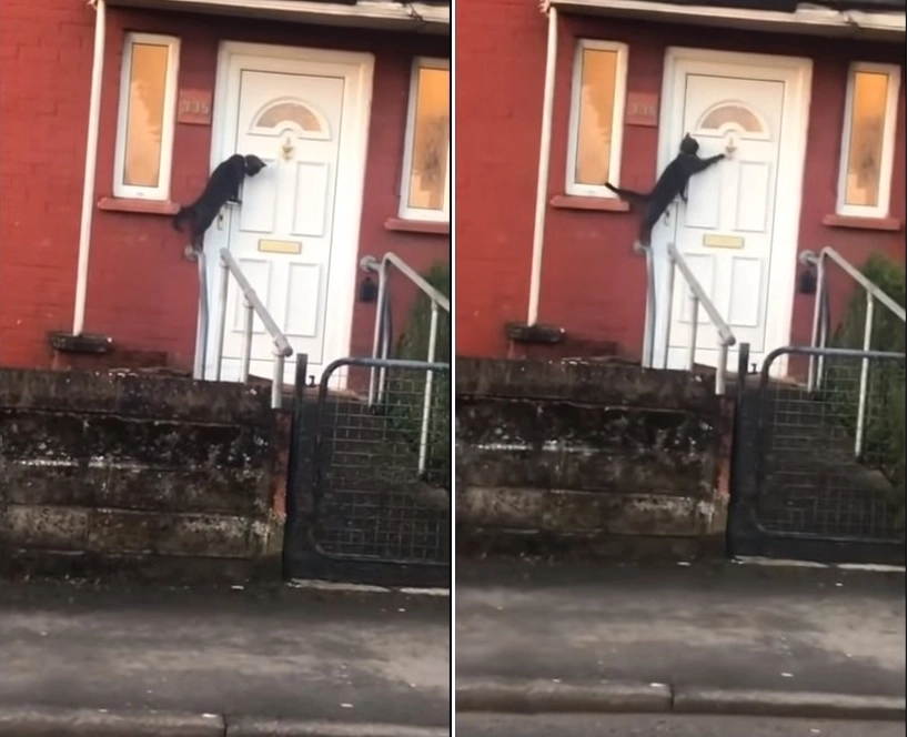 В видеоролике видно, как кот в ошейнике с довольно понурым видом стоит задними лапами на перилах дома и как будто собирается с духом, чтобы позвонить в дверь, затем протягивает лапу и аккуратно теребит дверное кольцо. В комментариях люди тут же решили, что это кот похож на провинившегося подростка, который вернулся домой после вечеринки под утро, потерял ключ, очень хочет спать, но боится звонить в дверь, потому что неминуемо получит нагоняй от родителей.