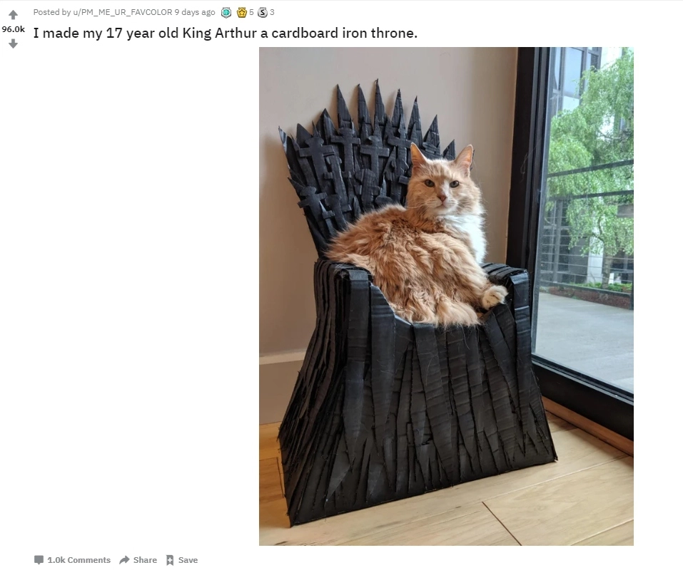 На портале Reddit стало вирусным фото большого рыжего кота, который величаво восседает на Железном троне, созданном по мотивам культового сериала «Игра престолов». Пост быстро поднялся в топ, собрав свыше 96 тысяч апвотов и тысячи комментариев, в которых пользователи восхваляют котов и утверждают, что именно они должны править миром.