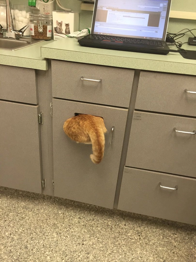 Фотографии почти невидимого Джеймса опубликовала в Twitter его хозяйка Эшли Перез (Ashly Perez) и нечаянно спровоцировала стихийный флешмоб. Оказалось, не один её котик прячется в самых странных местах при виде ветеринарного врача.