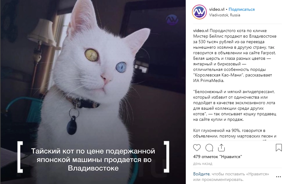 Кота с разноцветными глазами выставили на продажу за полмиллиона рублей