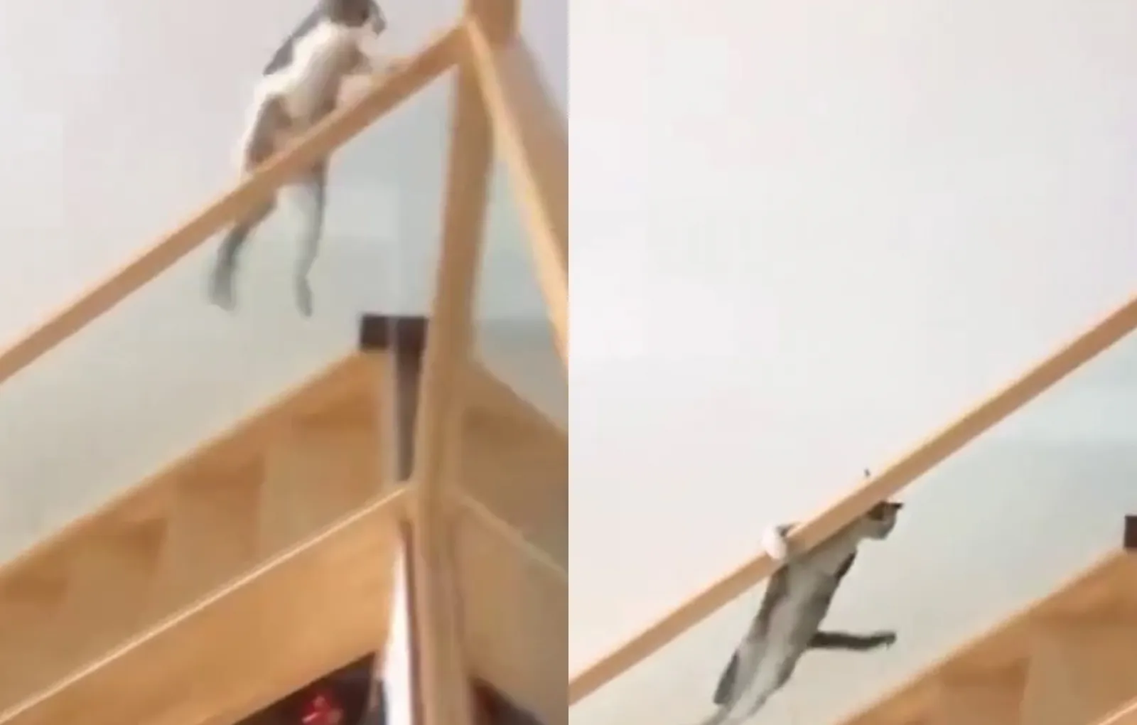 Но этот пушистый прохиндей пошёл дальше и придумал себе развлечение совершенно нового уровня. Он просто прыгает на лестничные перила и катается на них, зацепившись лапой. Отличная замена классическому тыгыдыку.