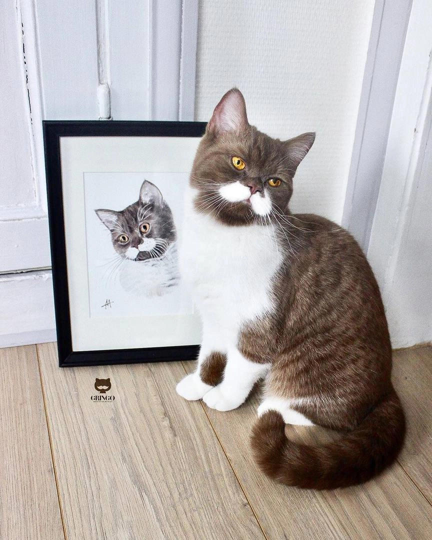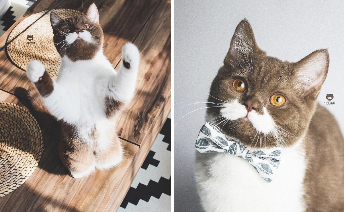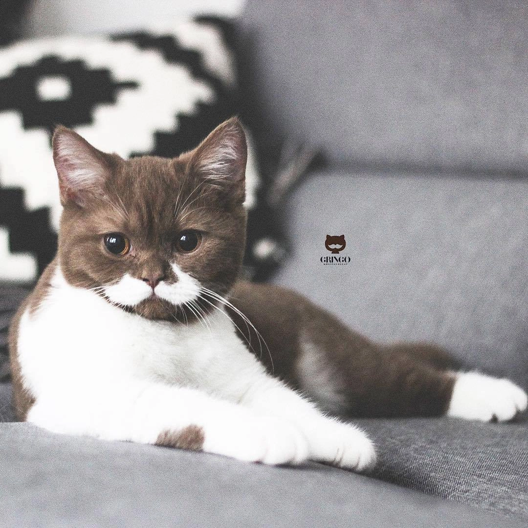 Соцсети покорил котик Гринго с длинными усами и французским очарованием. Годовалый кот британской породы живёт во Франции со своими хозяева Сабрин и Роменом и мохнатым собратом по кличке Милко. Владельцы говорят, что увидели фотографию кота на сайте питомника для животных и мгновенно решили забрать его к себе. Теперь коричнево-белый Гринго с усами детектива Эркюля Пуаро очаровывает людей по всему миру.