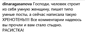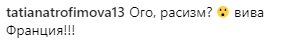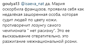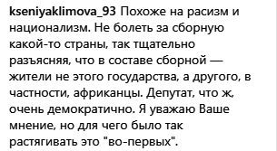 Некоторые интернет-пользователи посчитали ее высказывание расистским. «Похоже на расизм и национализм. Не болеть за сборную какой-то страны, так тщательно разъясняя, что в составе сборной — жители не этого государства, а другого, в частности африканцы», — отметила одна из подписчиц.