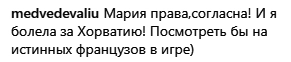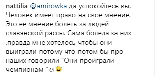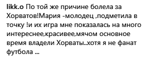 По мнению других комментаторов, в публикации Кожевниковой не было ничего оскорбительного. Кто-то признался, что болел за сборную Хорватии по той же причине.