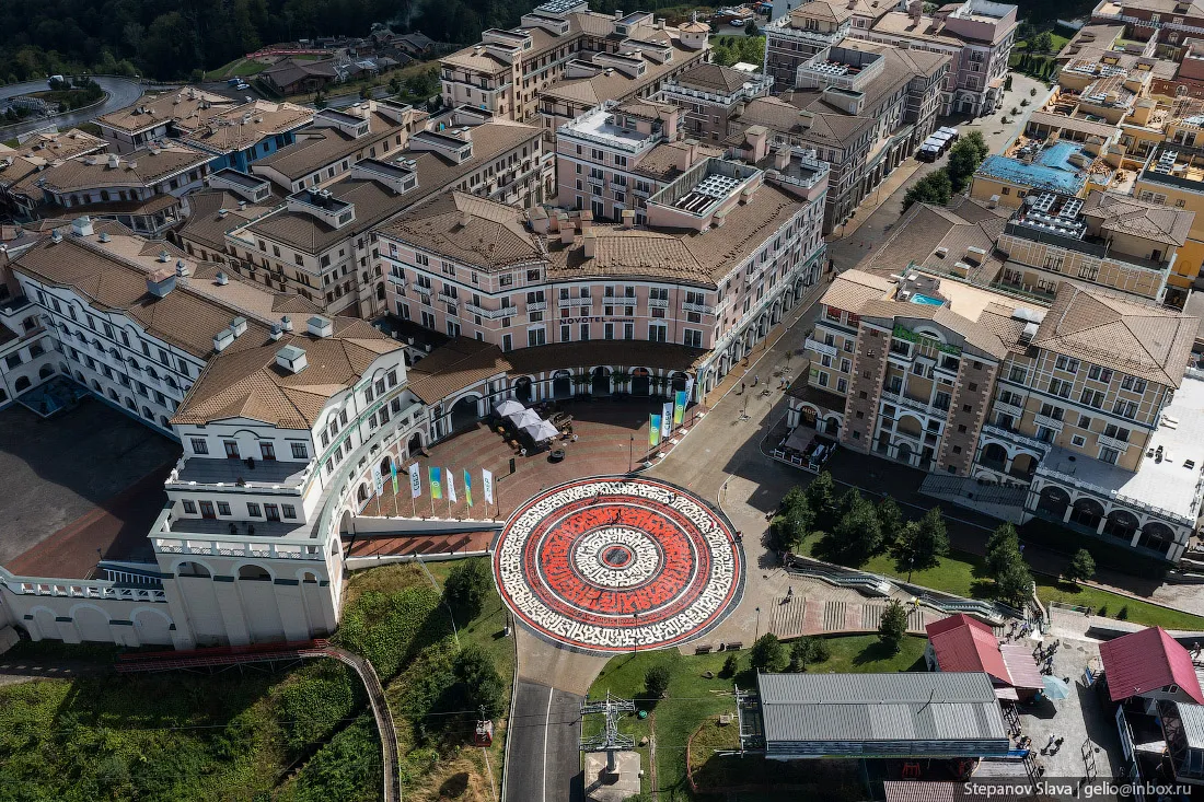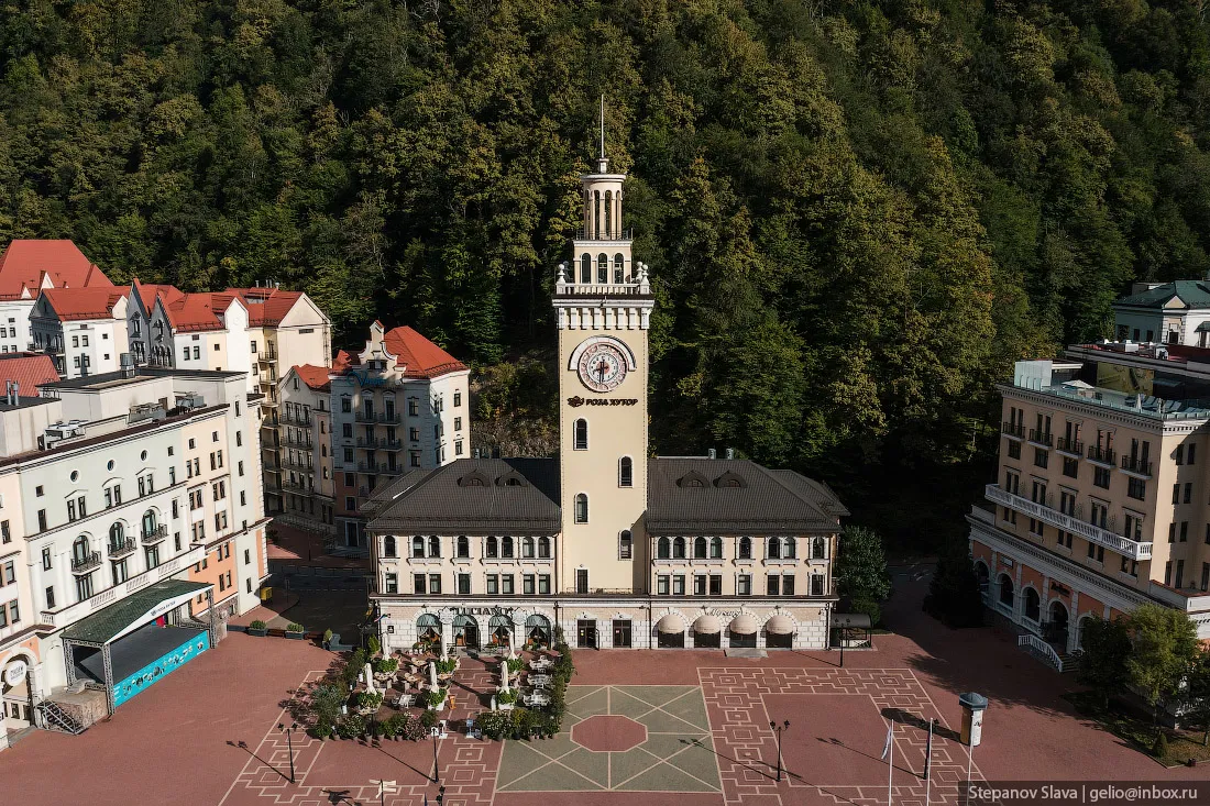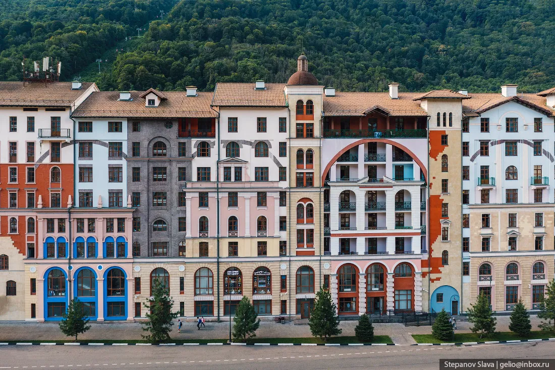 25. Говорят, что разработчики этой части курорта не очень довольны результатами — деталировки выполнены с нарушениями, фасады отличаются от тех, что были указаны в проекте. Но туристам нравится — считается, что это площадка для состоятельной аудитории. Здесь есть смотровые площадки, места для прогулок и отдыха, подъемники на горнолыжные трассы, горные бани, кафе, рестораны.