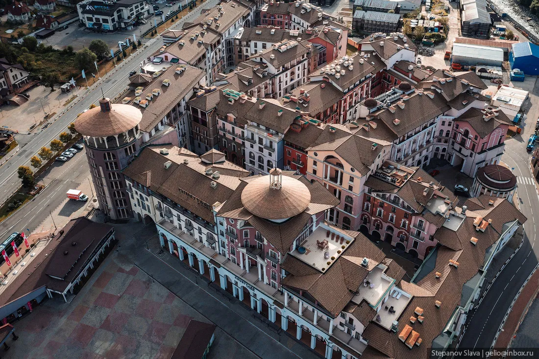 13. «Нижний город» расположен на отметке 540 метров над уровнем моря. Его проектированием занимались архитекторы мастерской Михаила Филиппова, которые сделали эту часть посёлка похожей на средиземноморский городок с площадями разных форм и размеров, переплетающимися улочками, сложным рисунком черепичных крыш.