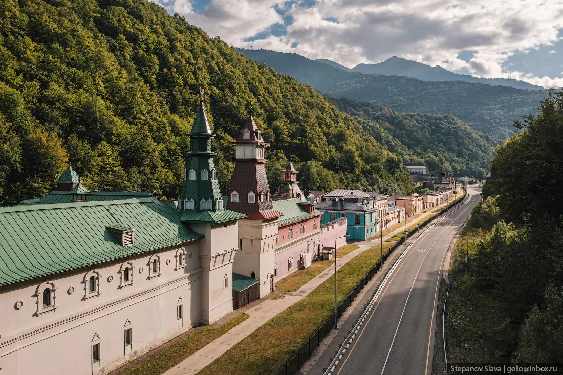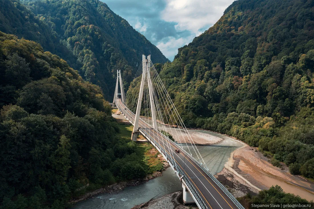 34. На машине путь от Адлера займет примерно час. На трассе туристы проезжают вантовый мост длиной 439 метров. Максимальное расстояние от дороги до дна ущелья — 218 метров. В начальных планах прокладки дороги к Олимпийским объектам этого моста не было, но при строительстве одного из тоннелей произошёл оползень и решили вместо этого установить вантовый мост. Теперь это не просто участок дороги, а одна из местных достопримечательностей.