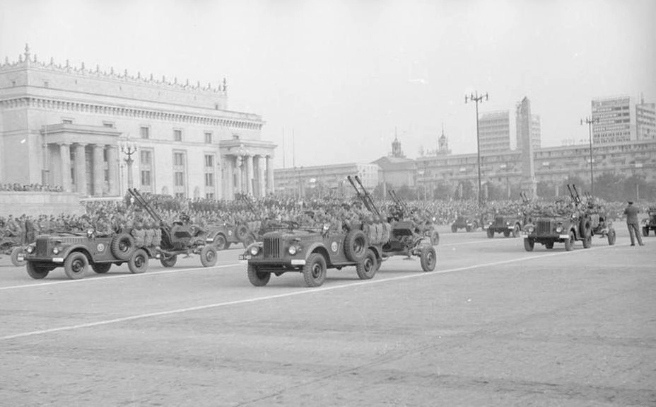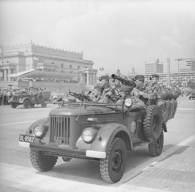 Автомобили ГАЗ-69 с безоткатными орудиями Б-10 из состава 6-й ВДД во время «Парада Тысячелетия» Narodowe Archiwum Cyfrowe