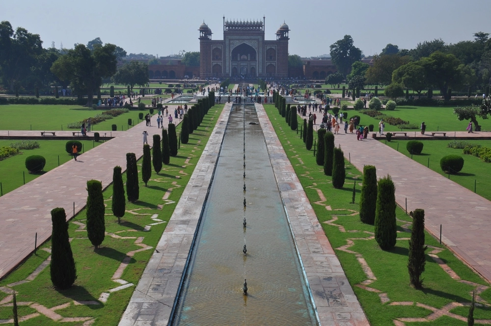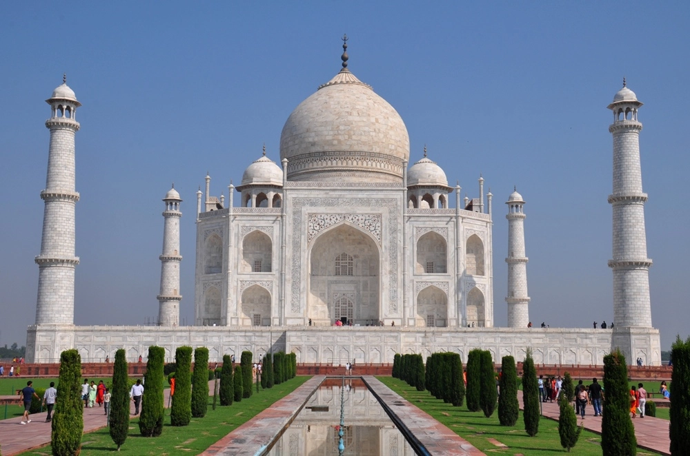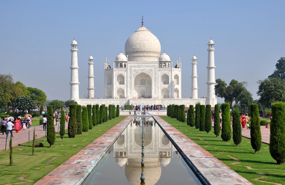 5.Классический ракурс Тадж-Махала. Перед мавзолеем расположен бассейн «Лотос», в котором купола отражаются как в зеркале.