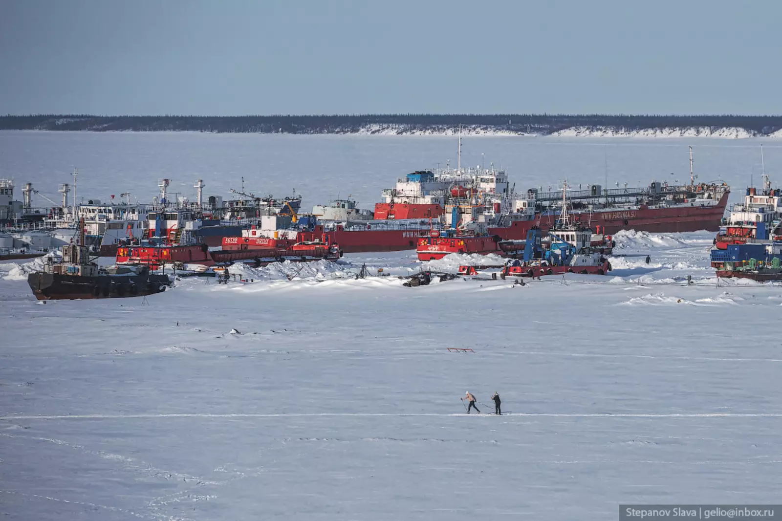 34. Обычный для посёлка урок физкультуры — дети катаются на лыжах по замёрзшей реке Хатанге.