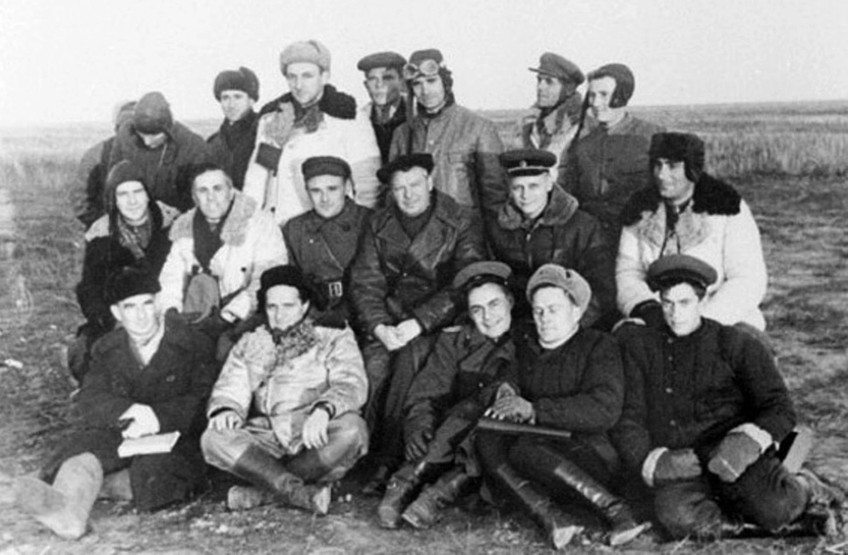 Участники первого пуска немецкой баллистической ракеты А-4 (V-2) на полигоне Капустин Яр, 18 октября 1947 года. Слева направо: первый ряд — М. И. Лихницкий, Н. А. Пилюгин, Г. А. Тюлин, Н. Н. Хлыбов, С. С. Лавров; второй ряд — М. С. Рязанский, В. П. Бармин, С. П. Королёв, С. И. Ветошкин, Л. М. Гайдуков, В. И. Кузнецов; третий ряд — В. П. Глушко, Д. Д. Севрук, Б. Е. Черток, М. И. Борисенко, Л. А. Воскресенский, В. А. Рудницкий, В. Болматков. РГАНТД. Ф.134, оп.3, д.19