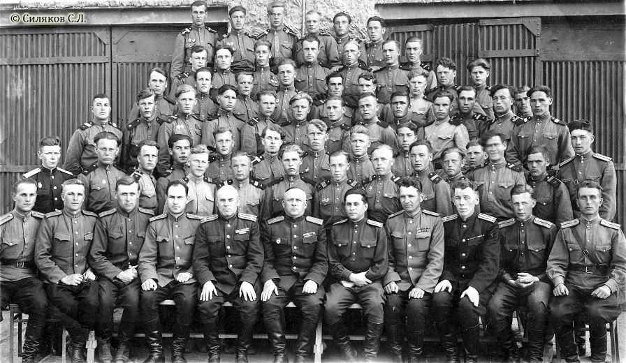 Личный состав 1-го испытательного управления (1 ИУ, в/ч 15646): военнослужащие 1-й и 2-й стартовых команд на фоне монтажного корпуса полигона Капустин Яр; в центре в первом ряду — А. Ф. Тверецкий; 20 апреля 1951 года. Фото из личного архива С. Л. Силякова kap-yar.ru