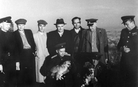 Группа специалистов после приземления подопытных собак на полигоне Капустин Яр, 1951 год. Слева направо: В. И. Яздовский, С. А. Христианович, И. Ф. Тевосян, С. П. Королёв, Н. А. Лобанов, А. А. Благонравов, В. И. Вознюк; с животными — В. И. Попов и А. Д. Серяпин. РГАНТД. Ф.134, оп.3, д.17